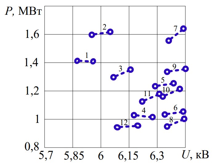 Данные поступали с периодичностью 1 раз в 150 сек. К расчету принимались значения пар с разницей по напряжению не менее 45 В при Uном=6000 В.. На рисунке 4 и в таблице 1 приведены зарегистрированные 12 пар с рассчитанными KРЭН,i.