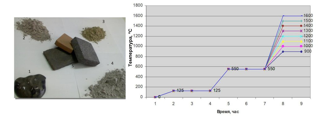 Преимущество рассматриваемого метода переработки буровых шламов в огнеупорные материалы состоит в том, что единственной принципиально нужной добавкой является небольшое количество недорогого алюминиевого порошка, необходимого для инициирования экзотермической реакции синтеза по формуле (1), которая в соответствии с уравнениями (2)-(5) должна выходить на устойчивый и самоподдерживающийся режим горения [15]. На практике, ввиду неадиабатичности реального процесса синтеза, естественным является возникновение теплопотерь при распространении волны горения в открытом пространстве, что характерно для многих методов внепечной металлургии и обычно легко компенсируется дополнительным локальным прогревом поверхности образца с помощью маломощного и мобильного источника тепла [10, 11], такого как газопламенная или плазменная горелка с контролируемой температурой факела [13, 14]. Дополнительно при этом формируется жаропрочный поверхностный слой [8]. Учитывая все вышесказанное, нами на начальном этапе разработки экспериментальной технологии переработки БШ для синтеза муллитовых огнеупоров использовалась электропечь типа ПВК-1,6-5 с максимальной температурой нагрева 1600°С, а в качестве добавки – порошок ПА-4 (ГОСТ 6058-73). Пробоподготовку и предварительную очистку БШ от загрязнения нефтепродуктами проводили по «сухой» технологии, основные этапы которой показаны на рисунке 4, где 1 – буровой шлам из месторождения Каменное (ХМАО-Югра); 2 – сухой порошок бурового шлама после 4 часов обработки в вакуумном сушильном шкафу ШСВ-65 при 125 ºС и остаточном давлении 10 миллиметров ртутного столба; 3 – сухой порошок БШ после 10 минут механоактивации в высокоэнергетической планетарной мельнице АГО-3 в смеси с 10% добавкой клиноптилолита (Na, K, Ca)2-3Al3(Al, Si)2Si13O36 •12H2O, сорбирующей остатки нефтепродуктов; 4 – реакционная шихта: смесь БШ и ПА-4 для приготовления шликерной массы; 5 – спеченные в печи образцы муллитовой огнеупорной керамики; справа на рис. 4 приведены графики температурных режимов синтеза в электропечи ПВК-1,6.