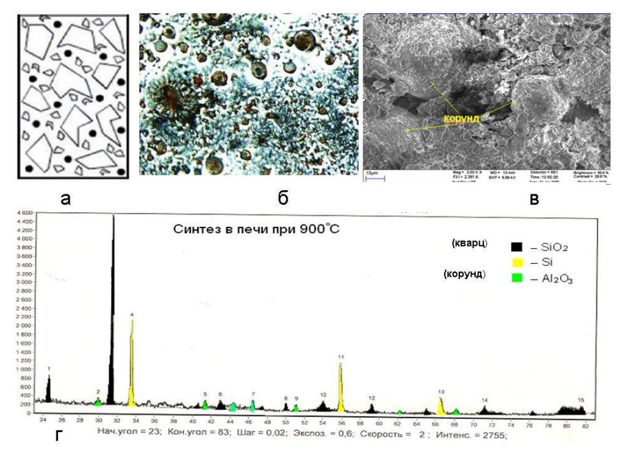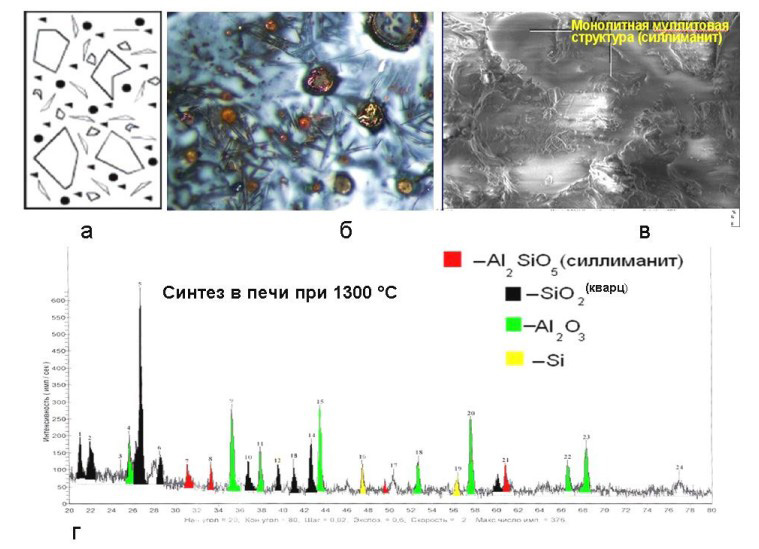 Процессы эволюции фрагментарной структуры муллитовых огнеупорных материалов при росте температуры синтеза (а), а также результаты оптической (б) и сканирующей электронной микроскопии (в) приведены на рисунках 6–8. Детальный рентгеноструктурный анализ продуктов отражен на вставках (г).