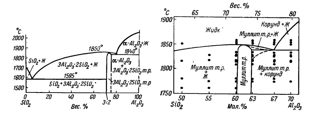 Рисунок 9 – Диаграмма состояния системы Al2O3-SiO2 (слева) и область диаграммы для соотношения химического состава от 3Al2O3·2SiO2 до 2Al2O3·SiO2 (справа) [12]
