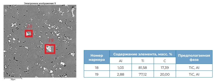По результатам микрорентгеноспектрального анализа (рисунок 4) в зоне сварного шва обнаружены элементы Al, Ti и С, что подтверждает присутствие армирующей фазы TiC в зоне сварного шва.
