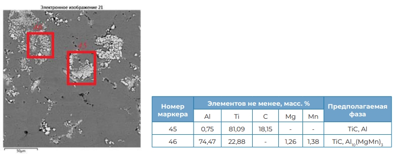 По результатам микрорентгеноспектрального анализа (рисунок 7) в зоне сварного шва обнаружены элементы Al, Ti, С, Mg и Mn. Таким образом, подтверждается присутствие армирующей фазы TiC в зоне сварного шва.