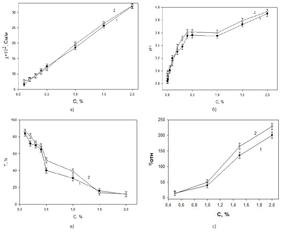 Рисунок 1. Зависимость свойств уксуснокислых (2 %) растворов хитозана (1 – контроль; 2 – f = 130 МГц) от концентрации (Т = 296 К): а – удельная электропроводность; б – рН; в – светопропускание; г – относительная вязкость.