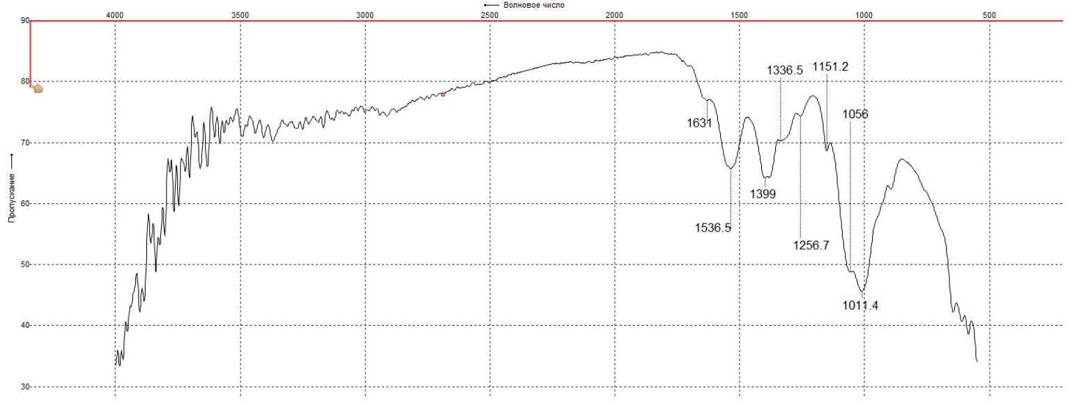 На ИК-спектре пленки хитозана в области 3700-3400 см-1 наблюдается широкая полоса, отвечающая валентным колебаниям OH- и NH- связей (рис. 2). Ее положение и ширина свидетельствуют о наличии межмолекулярных водородных связей, образующихся с участием этих функциональных групп. Слабая полоса 3102-3077 соответствует валентным колебаниям NH3+-групп. В области 1700-1500 см-1 проявляются полосы с максимумами 1536 см-1 (амид I) и 1399 см-1 (амид II), относящиеся к ацетилированной аминогруппе и подтверждающие, что образцы хитозана деацетилированы не полностью. Пик с максимумом 1336 см-1 отвечает деформационному колебанию ОН-связи. Пик при 1256 см-1 соответствует первичной аминогруппе (NH2). Между 1056 и 1011 см-1 наблюдаются широкие полосы поглощения, соответствующие гликозидной связи С-О-С [26, 27].