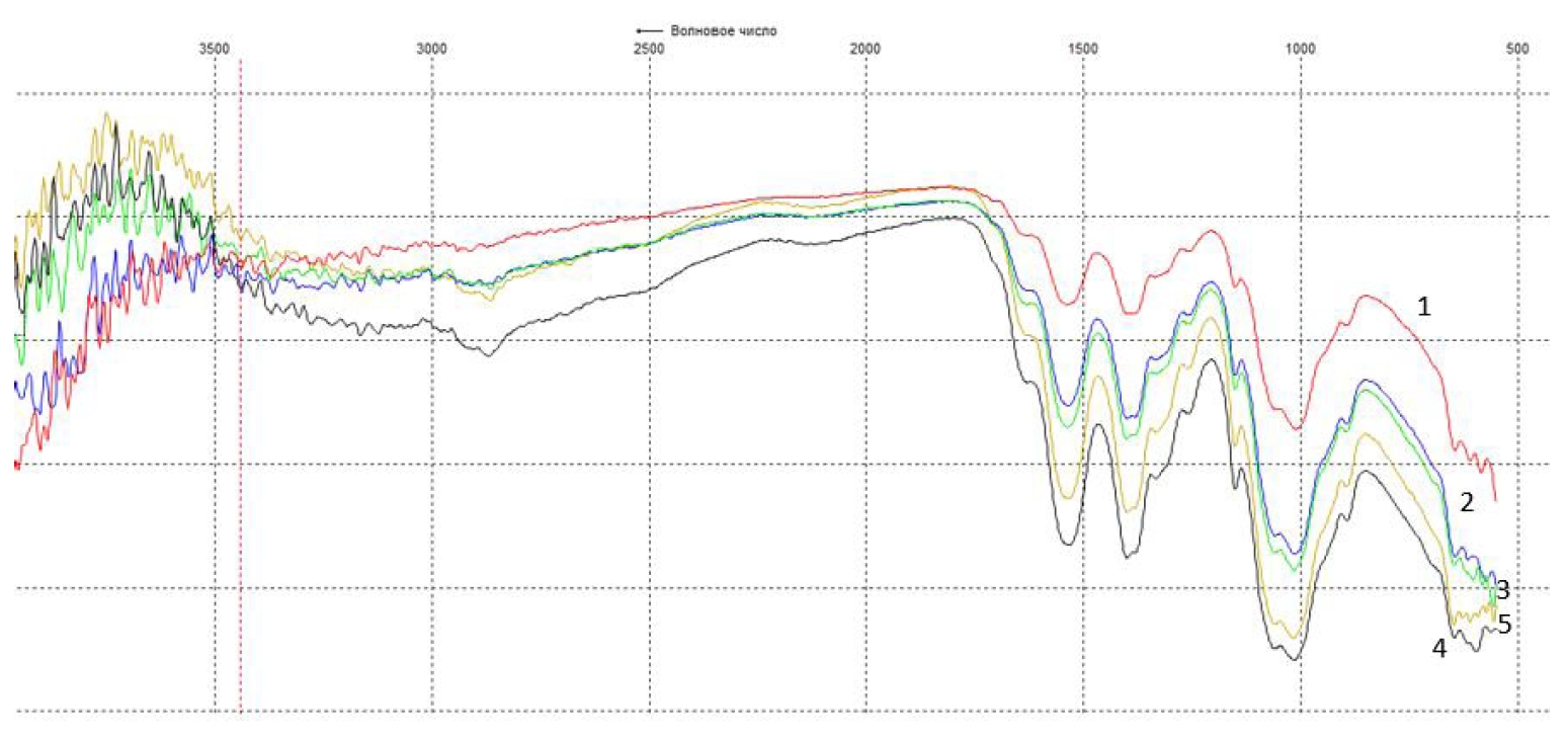 Рисунок 3. ИК-спектры пленок хитозана, полученных из 2 % уксуснокислых растворов хитозана: 1 – контроль; 2 – активированная вода (70 МГц); 3 – активированная вода (90 МГц); 4 – активированная вода (110 МГц); 5 – активированная вода (130 МГц).