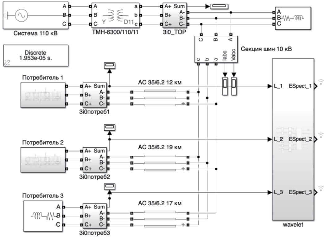 Модель сети, представленная на рисунке 1, включает 3 отходящих с секции шин трансформатора 10 кВ линий, нагрузка которых и ее гармонический состав варьируются в заданном диапазоне.
