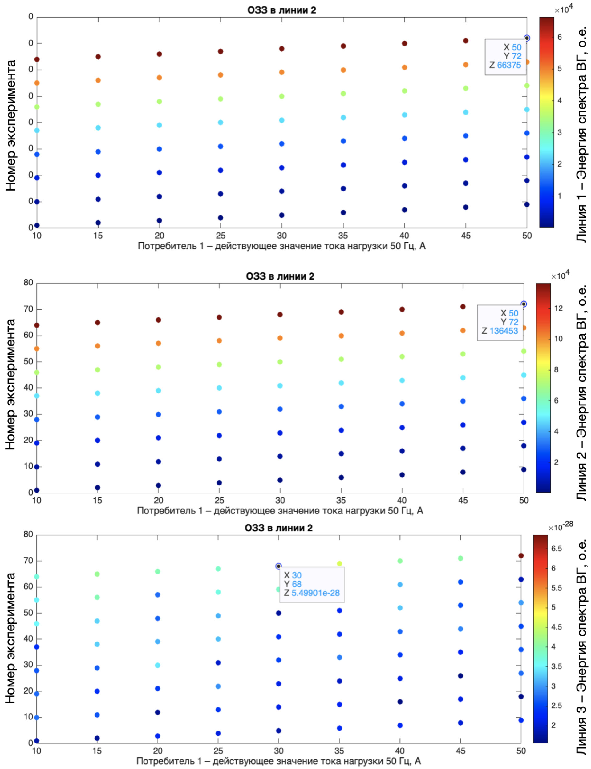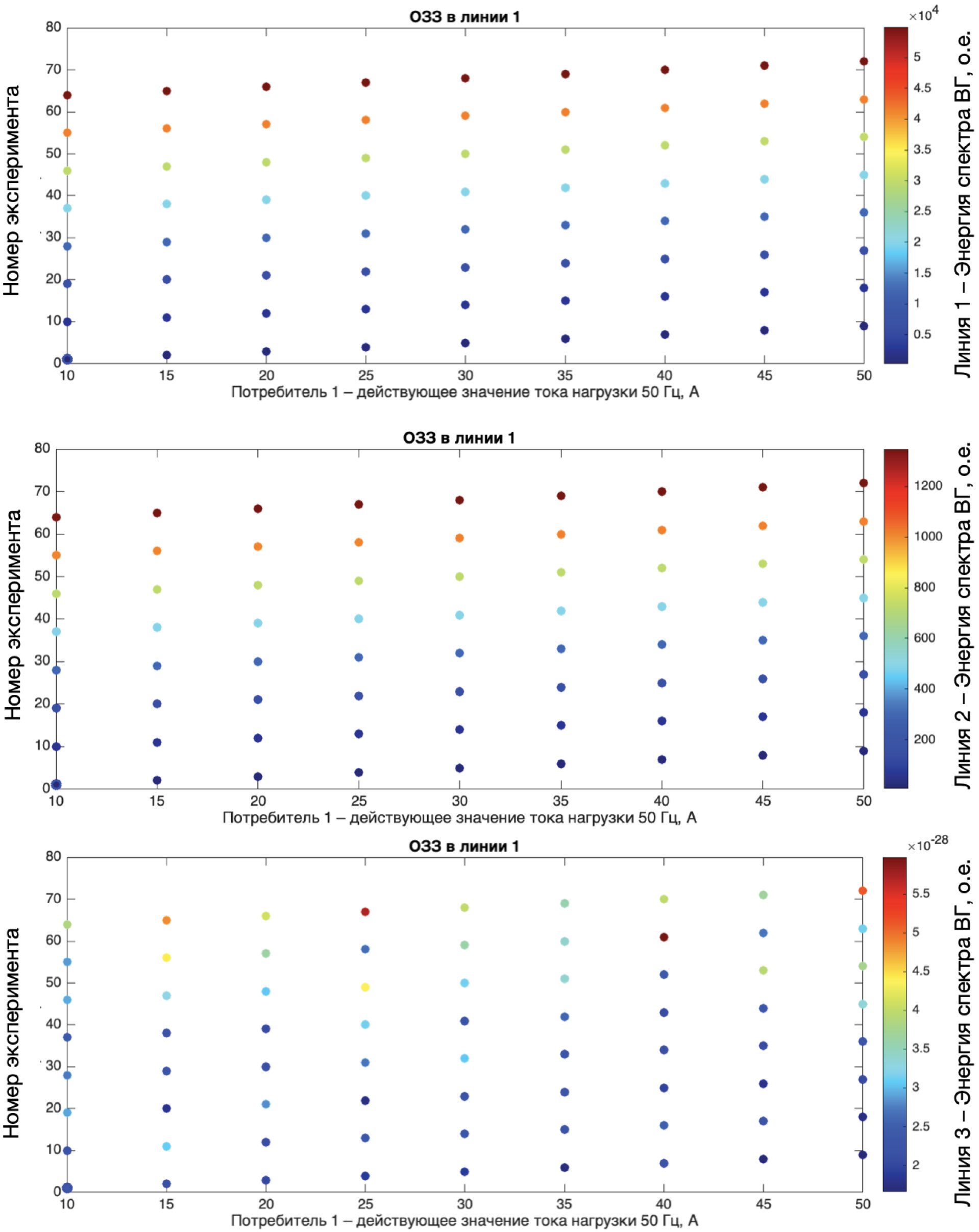 Эксперимент № 1 (рис. 2) подразумевает конфигурацию сети, состоящую из трех присоединений с ОЗЗ в конце линии 1, где начальным условиям соответствует следующий набор данных: нагрузка присоединений на частоте 50 Гц соответствует I1_50Гц=10 А, I2_50Гц=13 А, I3_50Гц=7 А; эксперимент включает 72 итерации с изменением I1_50Гц в диапазоне от 10 до 50 А с шагом в 5 А, а также I1_150Гц в диапазоне от 1 до 30 % опорной частоты с шагом в 4 %; нагрузка потребителей 2 и 3 неизменна.
