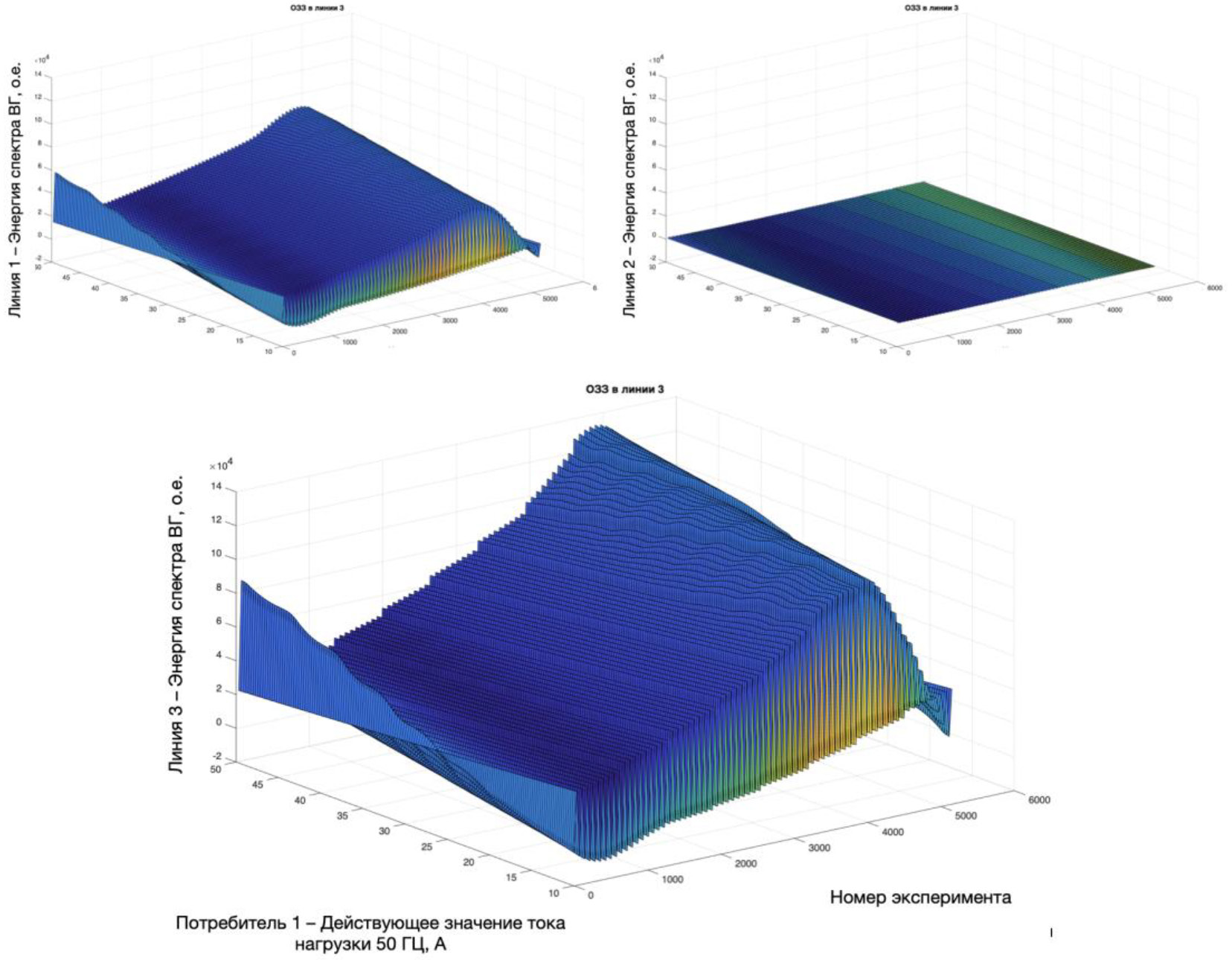 Распределение энергии спектра ВГ в токе 3i0 между присоединениями для наибольших и наименьших значений энергии спектра составило 1:0:2 о.е.
