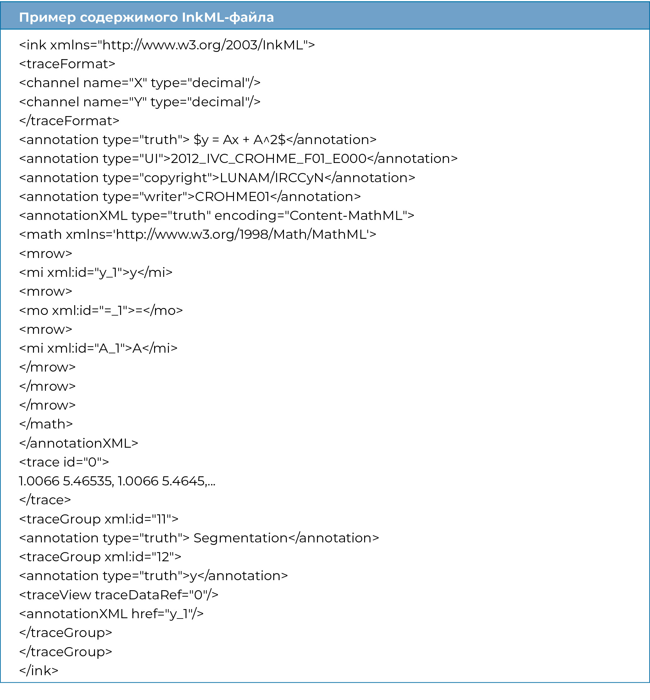 4. Тег <annotation type="UI">2012 _IVC_CROHME_F01_E000</annotation> содержит в себе информацию об уникальном идентификаторе отдельного InkML с указанием года создания, типа информации, конкурса и порядковых номеров в каталоге.