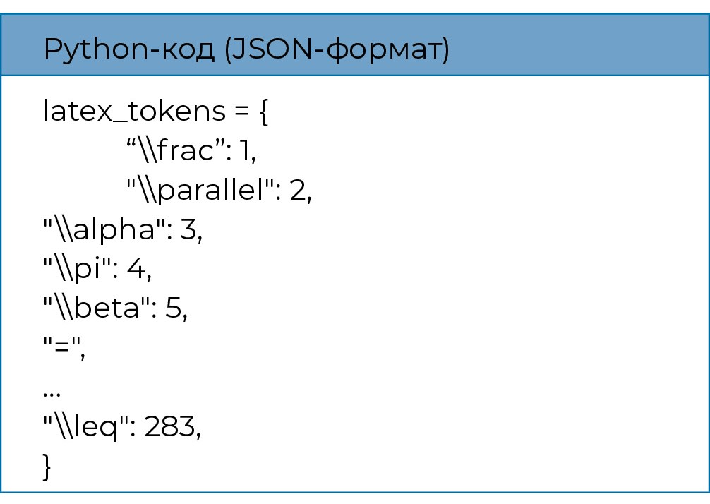 В качестве алгоритма токенизации был выбран алгоритм из библиотеки Tensorflow Keras и настроен таким образом, чтобы работать с готовым словарем, поскольку по умолчанию этот токенайзер работает только с текстом. Для настройки токенайзера на словарь LaTeX-выражения используется функция “re.findall” из библиотеки Regex (сокр. от Regular Expressions), которая работает с регулярными выражениями, описываемыми в словаре LaTeX-синтаксиса. Функция проверяет аннотации из файла InkML со значениями в словаре и разбивает формулу на отдельные составляющие и каждому из них присваивает номер. Например, формула: