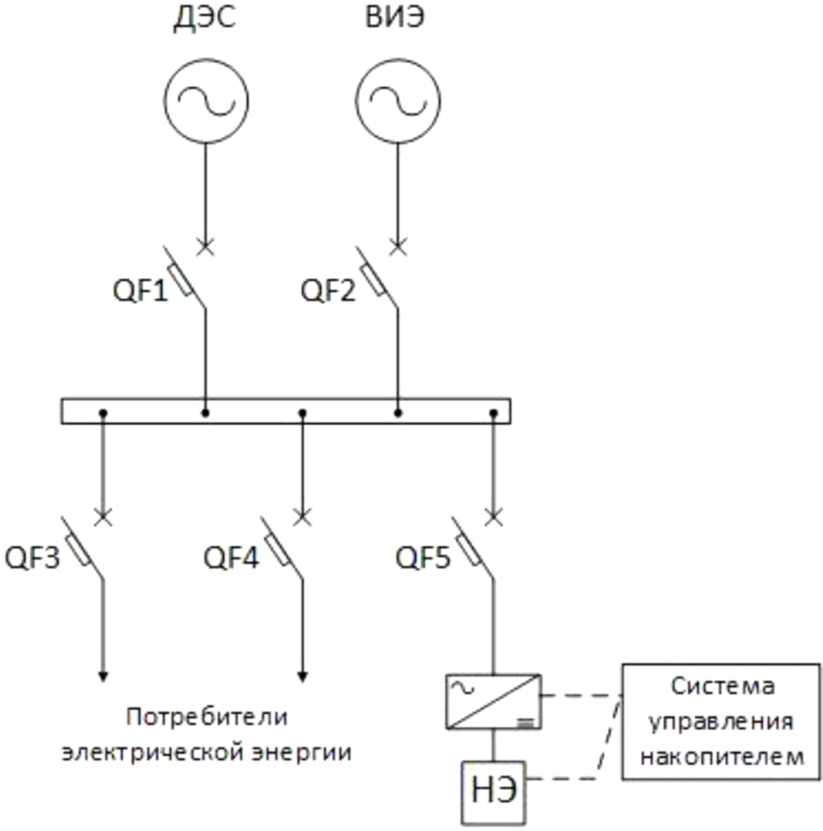 Для электроснабжения менее энергоемких потребителей актуально применение ДЭС как единственного источника электрической энергии либо в совокупности с солнечными или ветровыми электрическими станциями. Эффект от применения энергетических комплексов будет выше, если в совокупности с ними использовать накопители энергии (НЭ) [3], что позволит решить ряд проблем, таких как провалы напряжения, несовпадение графиков электрических нагрузок и графиков генерации электрической энергии (актуально при наличии ВИЭ в качестве источника питания), повышение надежности электроснабжения, а также позволит снизить затраты на строительство воздушных линий электропередач, подстанций, экономить моторное топливо в случае использования в качестве источника модульных ДЭС. На сегодняшний день отсутствует широкая практика использования НЭ в системах электроснабжения потребителей. Схема энергетического комплекса и подключения НЭ представлена на рисунке 1.