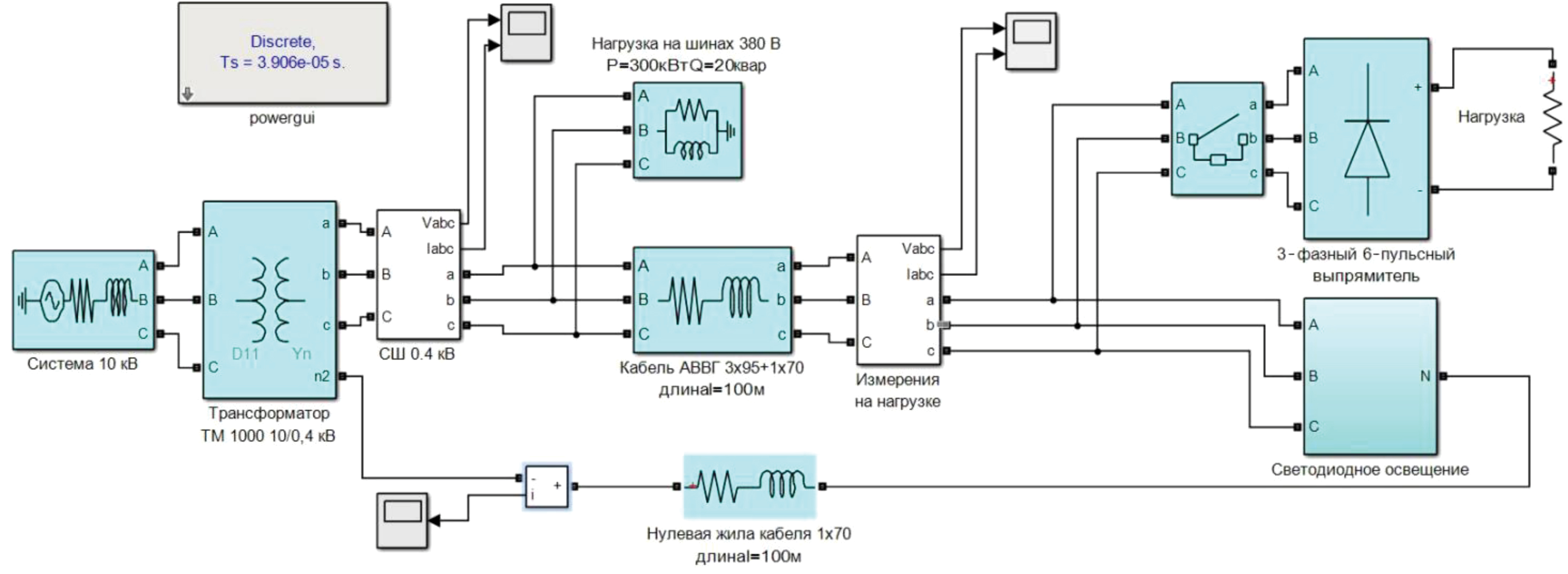 В качестве исследуемой сети примем систему электроснабжения предприятия, питающегося от трансформатора ТМ 1000 10/0,4. Нелинейная нагрузка по одной из отходящих из ВРУ линий представлена трехфазными 6-пульсными выпрямителями и системой светодиодного освещения. Имитационная модель представлена на рисунке 1.
