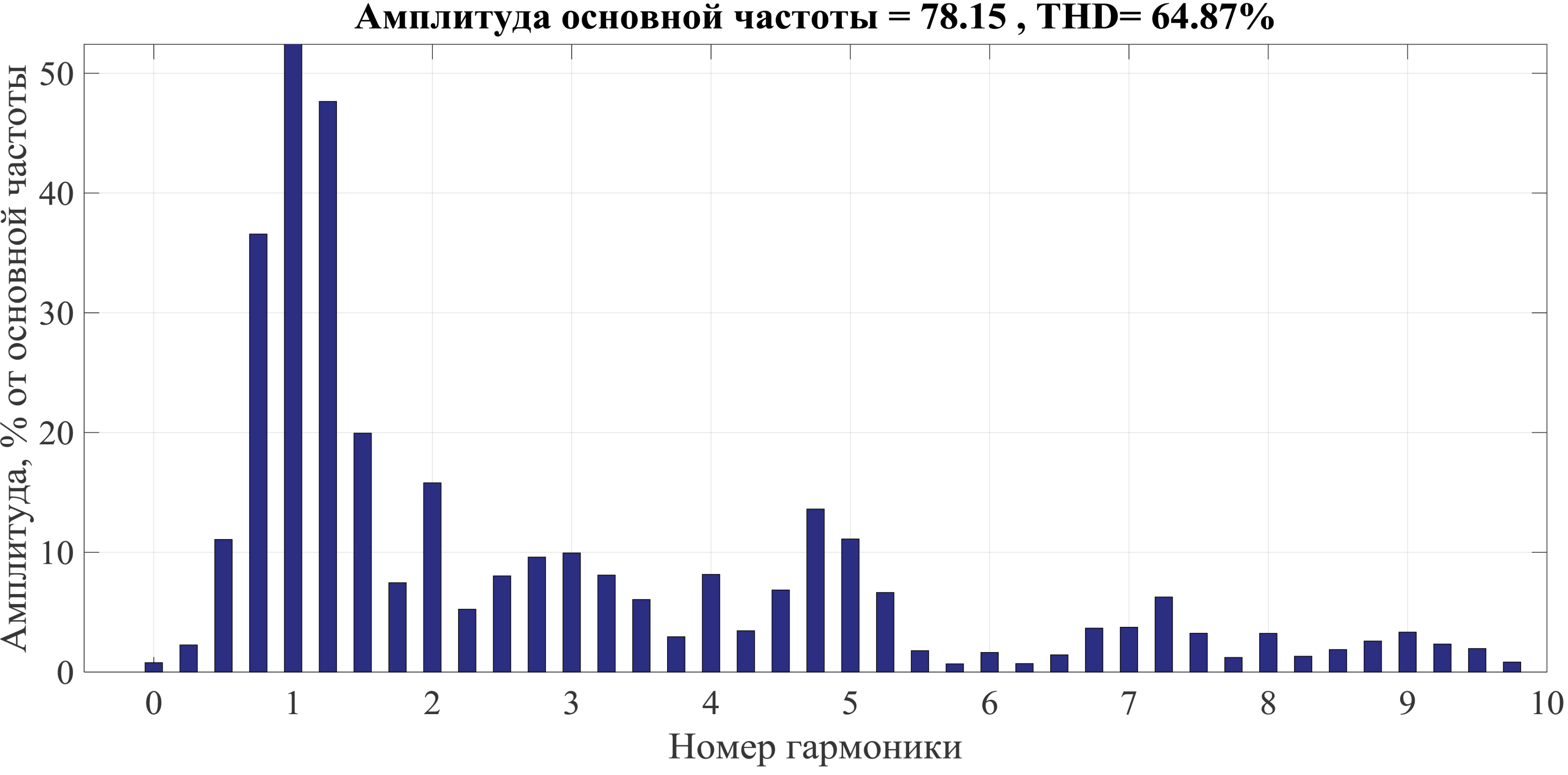 Для полученного фрагмента нестационарного несинусоидального сигнала проведем быстрое преобразование Фурье, используя Matlab. В результате, представленном на рисунке 3, получаем характерный вид спектрального состава при наличии фактора – «эффект растекания спектра».