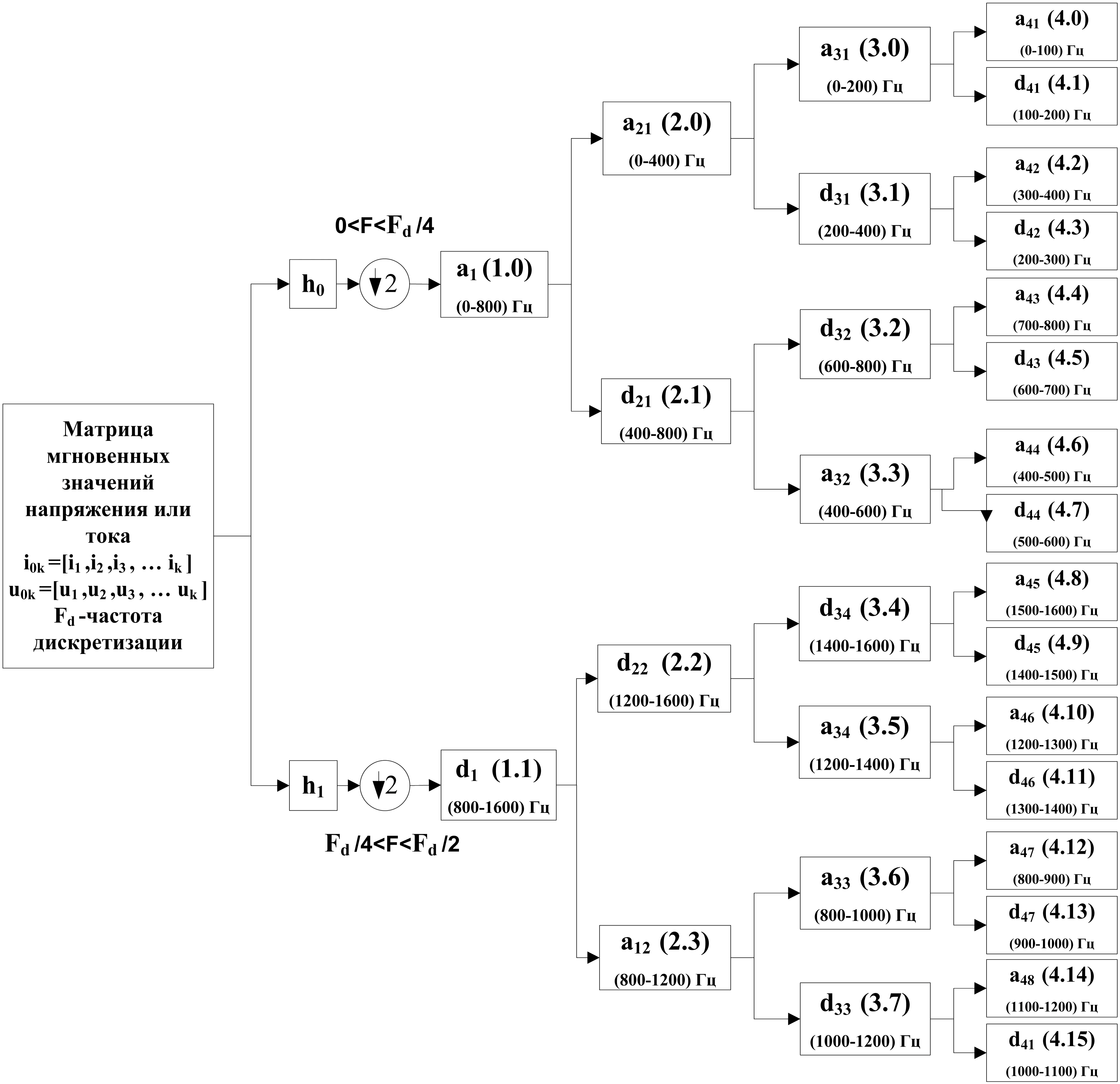 Проведем анализ полученных осциллограмм тока с помощью пакетного вейвлет-преобразования. Cхема пакетного вейвлетпреобразования для исходного сигнала с частотой дискретизации Fd=3,2 кГц представлена на рисунке 4.