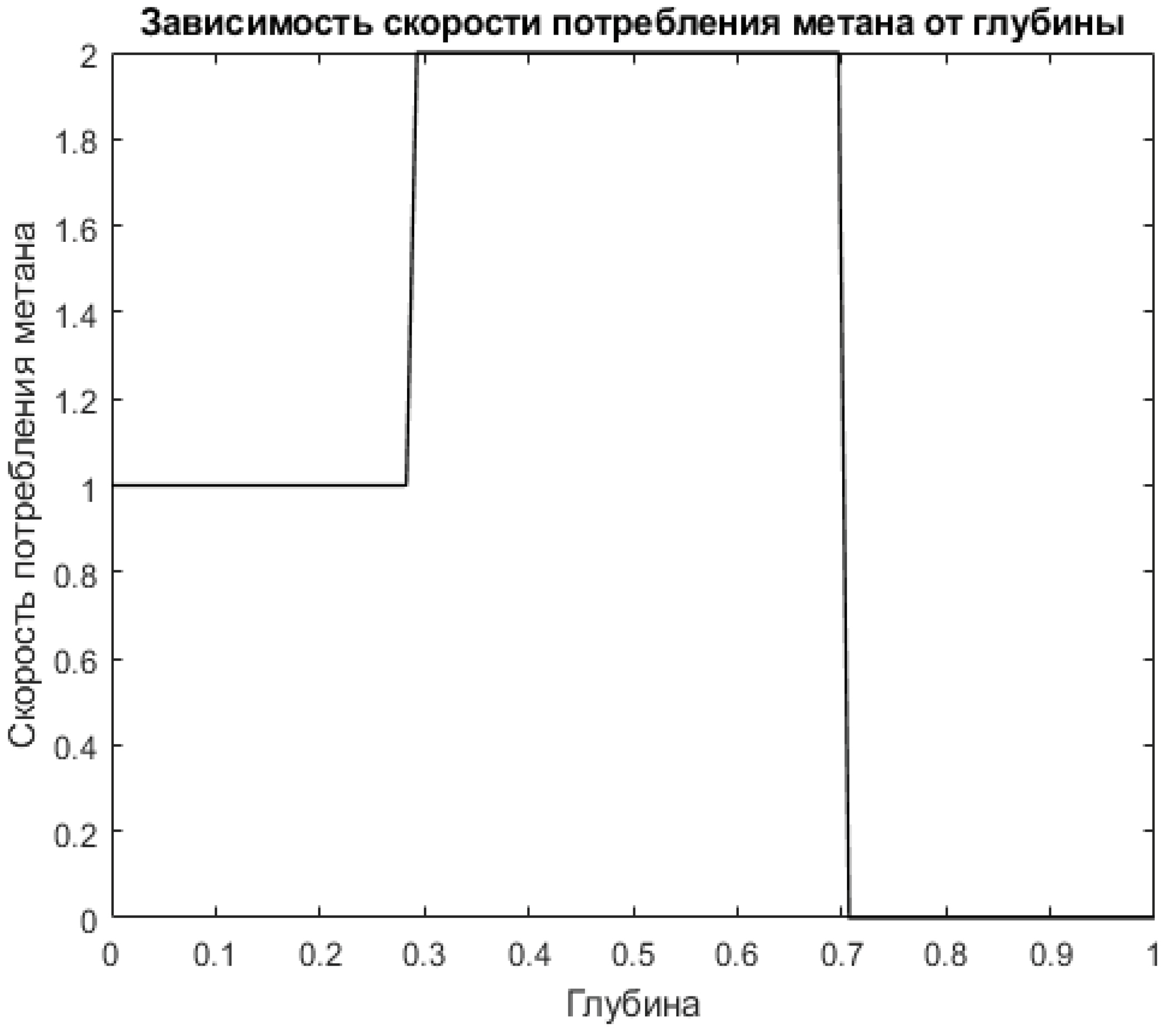 В результате расчётов было восстановлено исходное значение функции в точках потребления метана по глубине на основе распределения концентрации метана по глубине. В качестве входных данных были взяты значения функции в точках замеров. Значения одномерного массива метана были получены в ходе решения прямой задачи согласно системе (3), где входным вектором скорости потребления метана выступал некоторый экспериментальный одномерный массив данных [3], представленный на рисунке 1.
