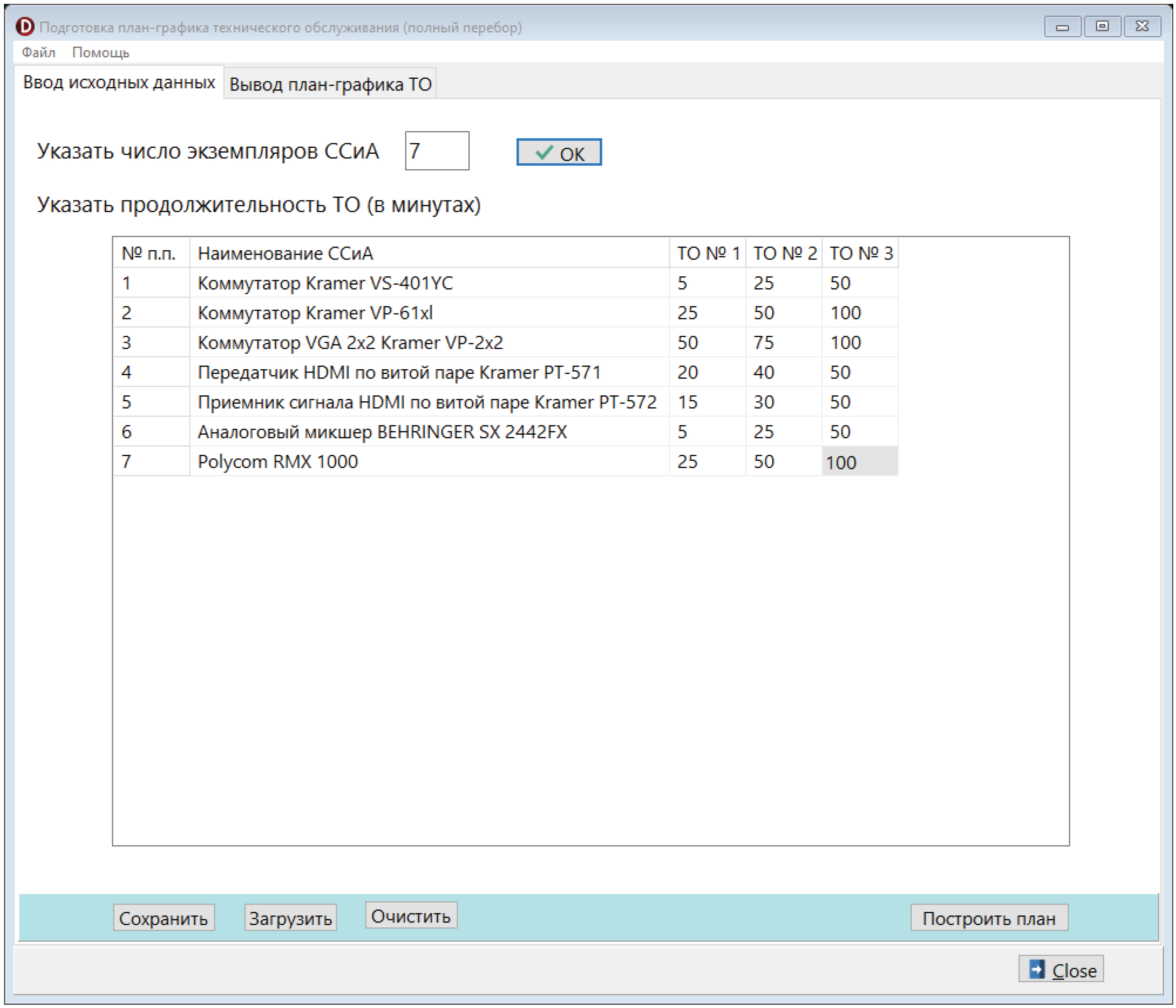 Ввод исходных данных включает в себя регистрацию данных о продолжительности проведения технического обслуживания каждого вида для экземпляров ССиА. В целом определение времени технического обслуживания может представлять собой отдельную задачу, но следует отметить, что любой сотрудник при наличии опыта может указать определенное значение как экспертную оценку, соответствующую требуемой продолжительности.