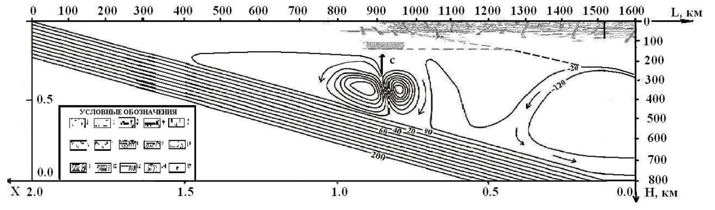 На рисунке 1 изображен глубинный геолого-геофизический разрез квазистационарного распределения безразмерной функции тока в мантийном субдукционном клине, расположенном на акватории Черноморской литосферной плиты, погружающейся под Русскую континентальную литосферную плиту, с учетом эффектов диссипативного нагрева и конвективной неустойчивости для неньютоновской реологии мантии и концентрации воды Cw = 3×10-1 весовых %% в горных породах мантии. Вертикальная стрелка (с) показывает восходящий конвективный поток. В верхней части рисунка приведен реальный геолого-геофизический разрез мантии [6] по профилю от полуострова Крым по направлению на северо-запад, к Русской литосферной плите. Условные обозначения: 1 – осадочные породы; 2 – дислоцированные породы молодого фундамента; 3 – поверхность молодого фундамента; 4 – поверхность дорифейского фундамента (V=6.2-6.5 км/с); 5 – «гранитный» слой; 6 – породы основного состава (V=7.0 км/с); 7 – породы коро-мантийного слоя; 8 – поверхность коро-мантийного слоя (V=7.5-7.6 км/с); 9 – граница Мохоровичича; 10 – сейсмические горизонты верхней мантии; 11 – слои с пониженной скоростью в верхней мантии по данным ГСЗ; 12 – поверхность астеносферного слоя по геотермическим данным; 13 – поверхность астеносферного слоя по данным МТЗ; 14 – глубинные тектонические разломы; 15 – очаги землетрясений.
