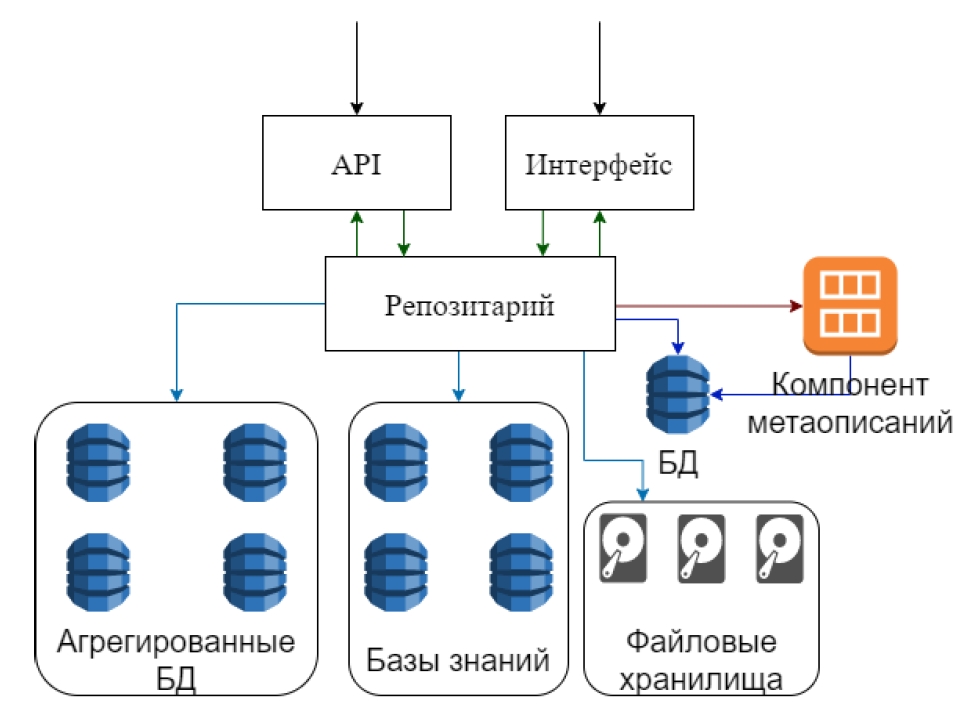 На основе предыдущих разработок [22], была разработана структура Хранилища данных и знаний и обеспечения доступа к ним на основе Репозитария. Репозитарий предоставляет доступ к агрегированным сведениям, хранящимся в базах данных; семантическим моделям, хранящимся в базах знаний; различным отчётным данным и статьям, которые хранятся в файловых хранилищах.