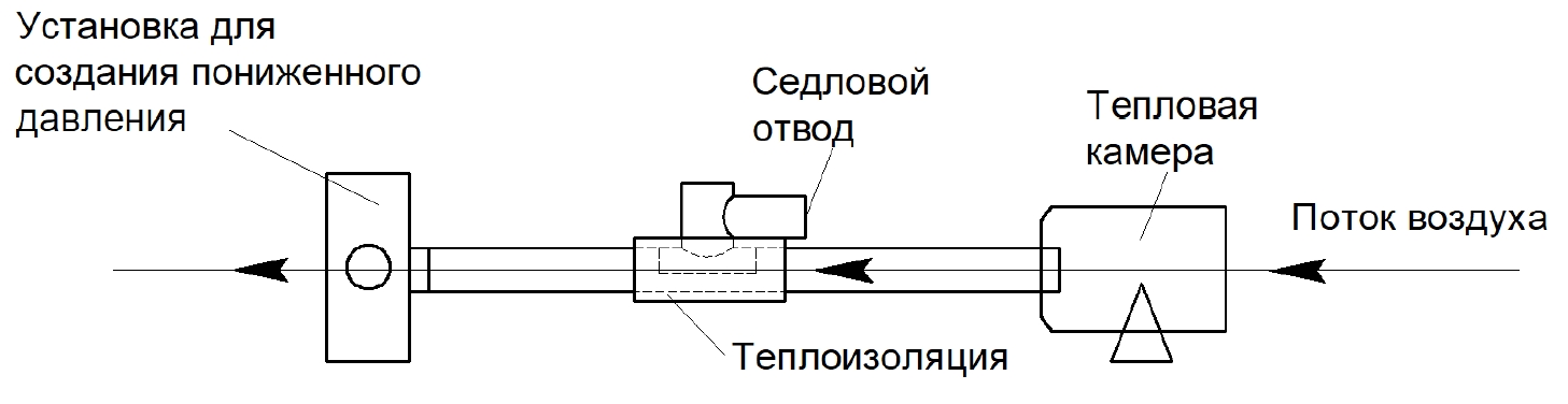 Во время сварочных работ нагретым воздухом в трубе имитировалось движение газа со скоростью 10 м/с. Имитация потока газа осуществлялась подключением установки для создания пониженного давления внутри трубы на одном конце трубы и тепловой камеры с температурой воздуха -6 °С на другом (рисунок 1).
