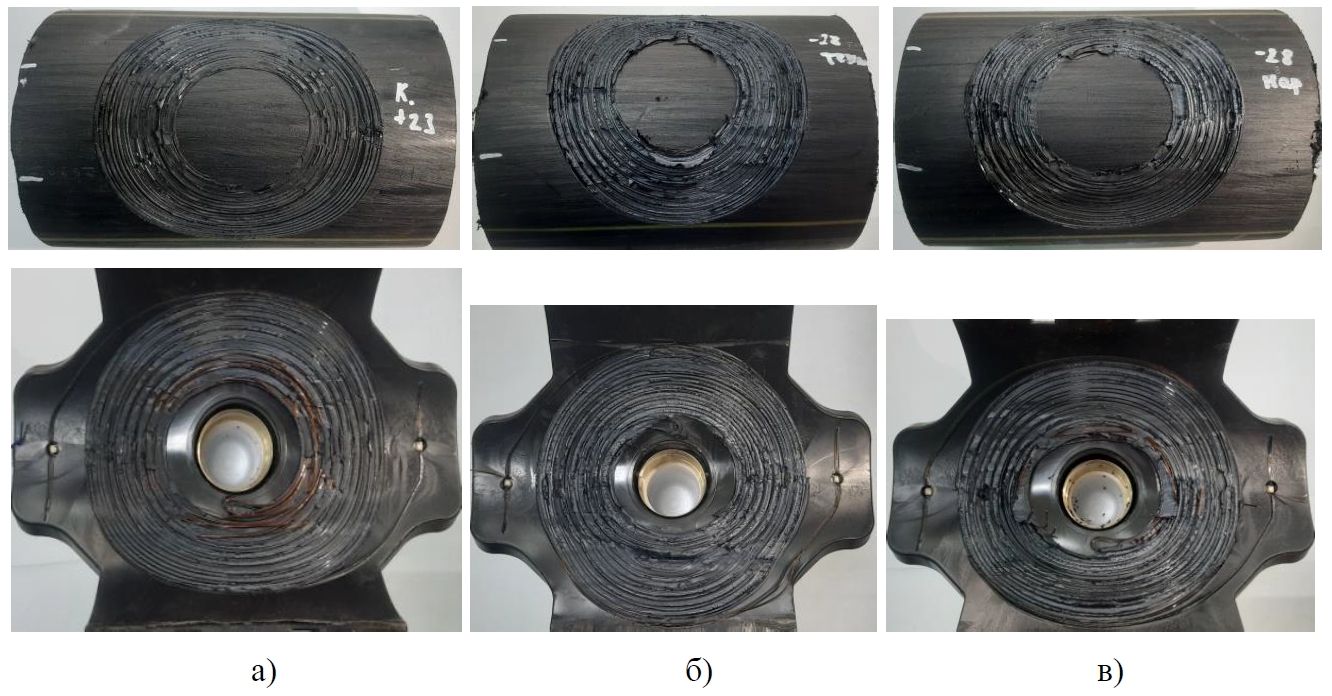 Рисунок 3 – Образцы сварных соединений ПЭ100 SDR 11 d110/63 после испытаний на отрыв при растяжении: а) режим 1; б) режим 2; в) режим 3