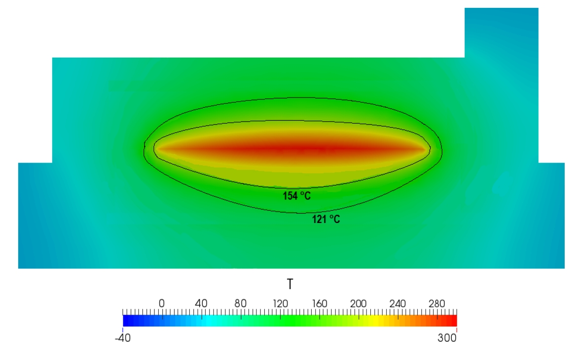 После сборки соединения производился предварительный подогрев закладным нагревателем и выдержка для выравнивания температур с параметрами, рассчитанными по формуле (1). Предварительный подогрев сварного соединения до максимальной температуры 55 °С осуществлялся путем подачи на клеммы нагревателя седлового отвода напряжения 12 В от сварочного аппарата HORNER HCU300 в течение 576 секунд. Время выдержки для выравнивания температуры в стенках свариваемых деталей до 20 °С составило 240 с.