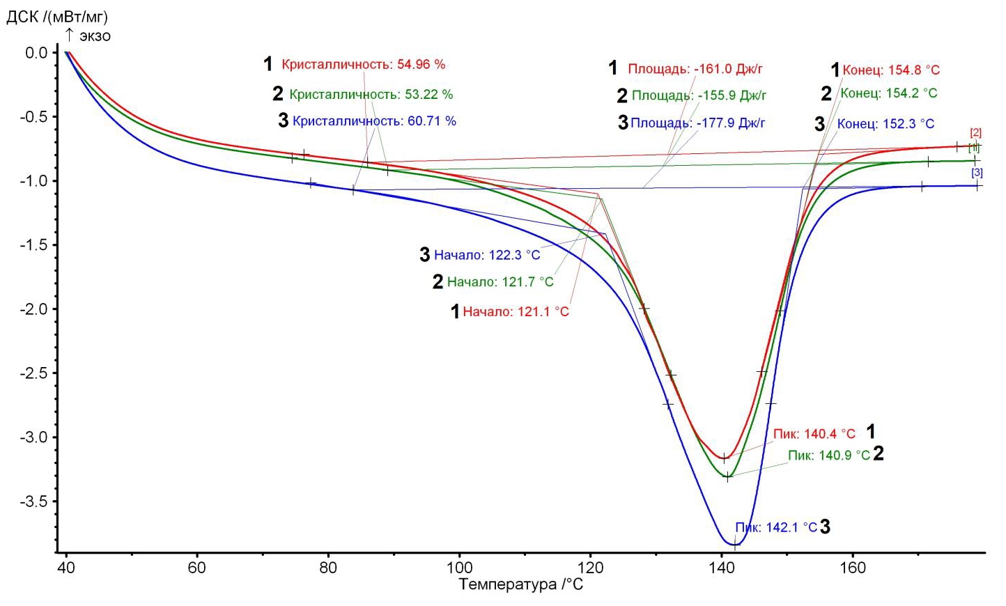 На рисунке 5 приведены кривые ДСК плавления образцов сварных соединений, выполненных по режимам сварки 1–3. Данные получены при скорости нагрева 20 С°/мин.