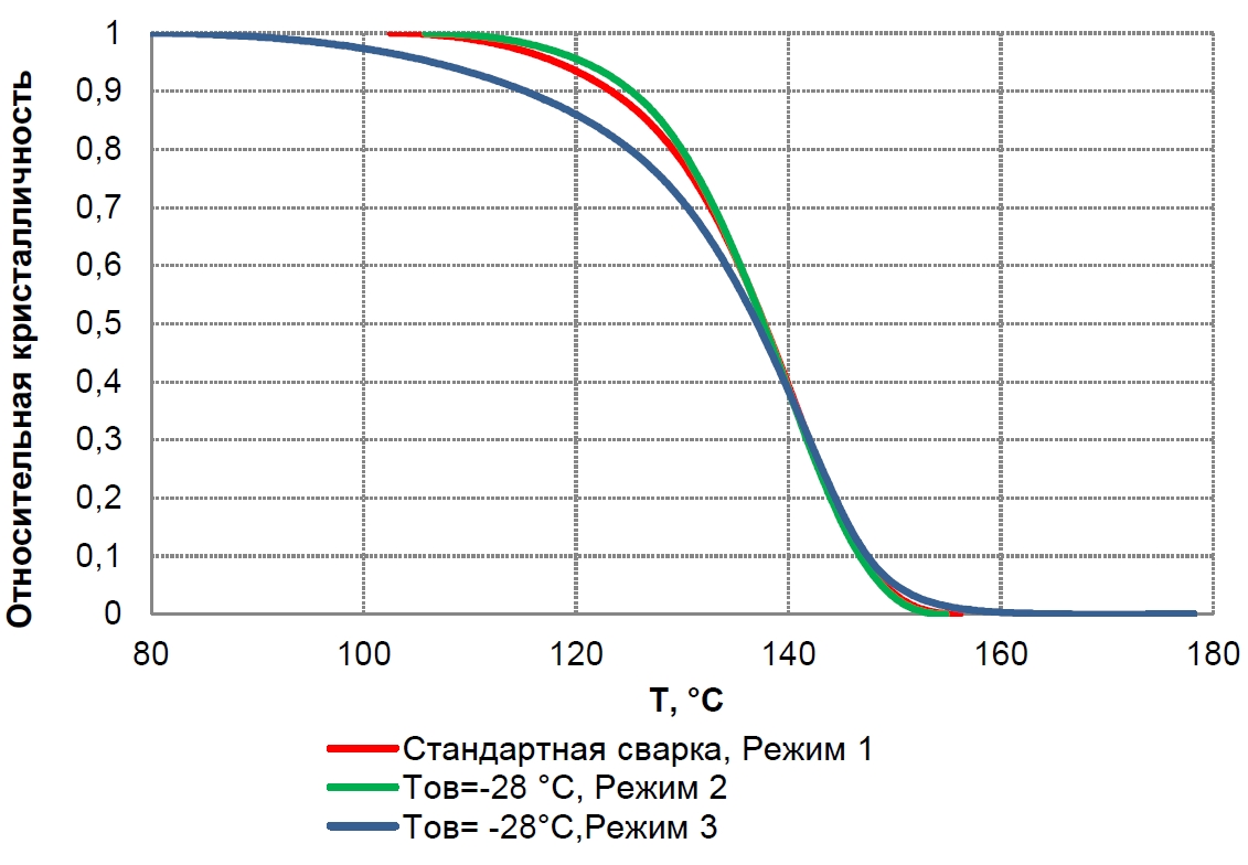 Исследование кривых относительной кристалличности образцов сварных соединений показало, что кинетики плавления материала соединений, полученных при 23 °С по стандартной технологии и при -28 °С по разработанной технологии практически идентичны, что свидетельствует о том, что применение предварительного подогрева и слоя теплоизоляционного материала расчетной толщины при охлаждении сварного соединения во время сварки при отрицательных температурах ОВ приводит к формированию структуры материала ЗТВ, близкой к структуре материала сварного соединения, выполненного при положительных температурах.