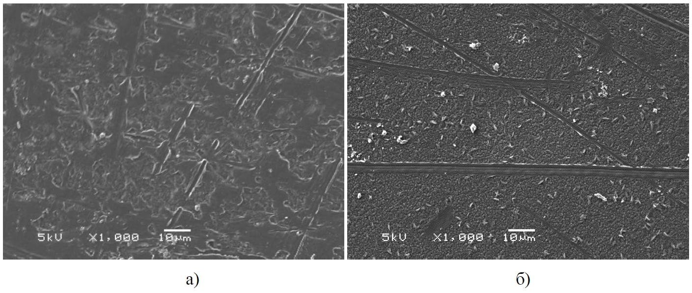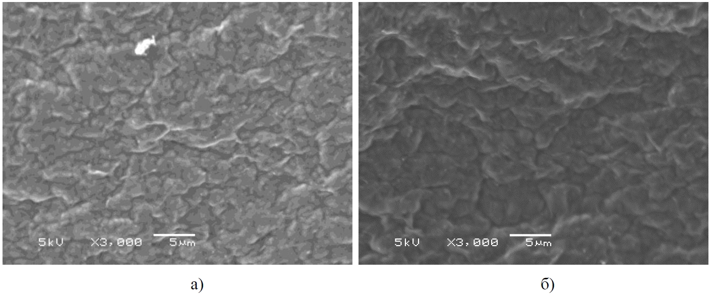 На рисунке 11 приведены изображения структуры материала в ЗТВ со стороны отвода сварных соединений. К сожалению, наличие пленки, образовавшейся в процессе травления образца, затрудняет проведение полного анализа структуры, сформировавшейся в процессе сварки (рисунок 11, а). Тем не менее, можно сделать вывод, что сформировалась сферолитная структура с размерами образований от 2 до 5 мкм. С удалением от сварного шва в зоне термического влияния седлового отвода в результате недостаточного плавления при нагреве и быстрого охлаждения формируется надмолекулярная структура материала не сферолитная, а фибриллярная с хаотичным расположением фибрилл (рисунок 11, б).