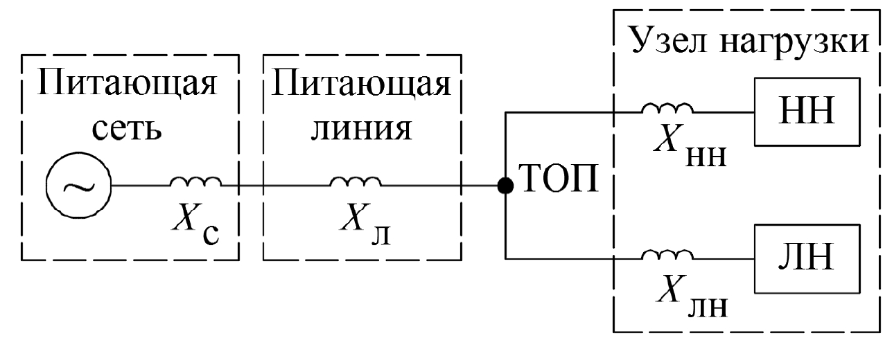 Рисунок 1 – Упрощенная структура имитационной модели промышленной системы электроснабжения с линейной и нелинейной нагрузками (ТОП – точка общего присоединения, НН – нелинейная нагрузка, ЛН – линейная нагрузка)