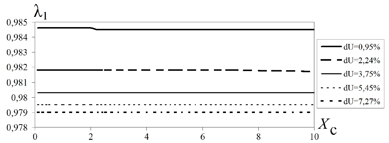 Рисунок 3 – Зависимости λ1 от Xс при вариации Xл в соответствии с различными уровнями потерь напряжения dU