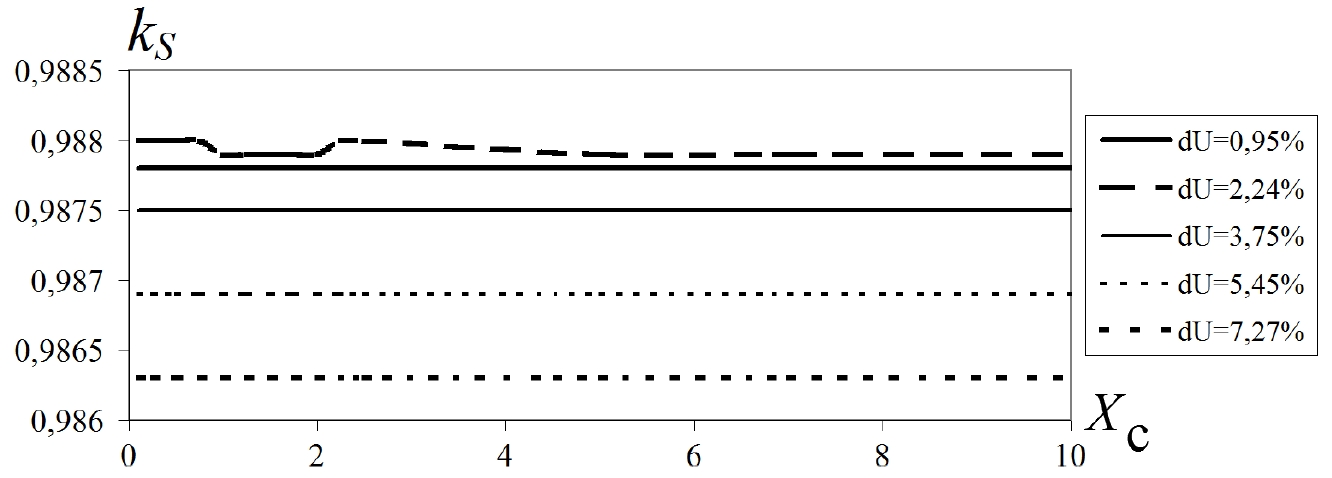 Рисунок 4 – Зависимости kS от Xс при вариации Xл в соответствии с различными уровнями потерь напряжения dU