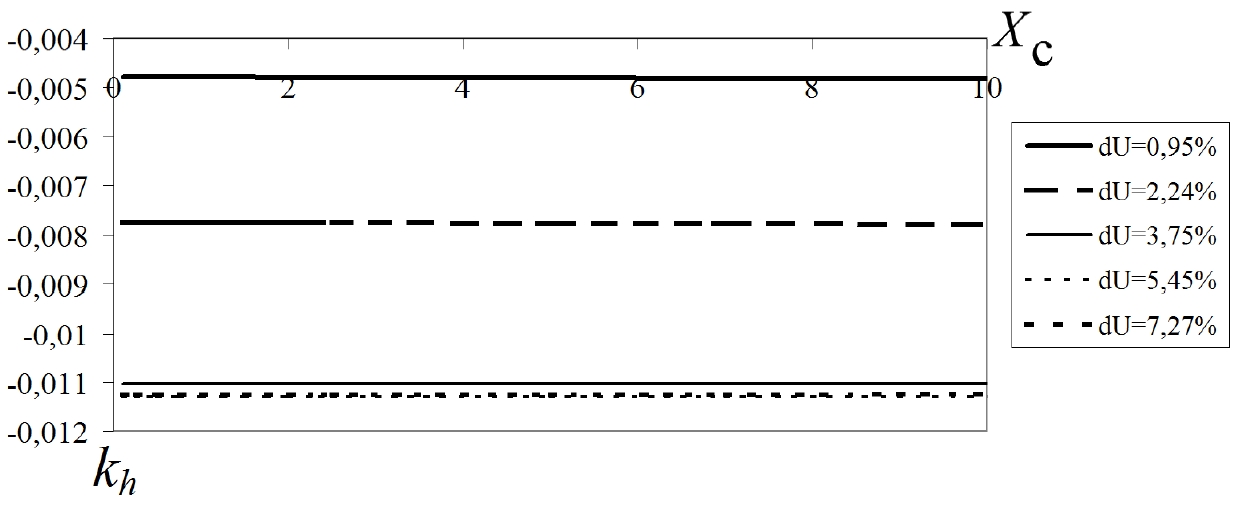 - также в области малых значений потерь напряжения (длина питающей линии незначительна) при наличии искажений со стороны питающей сети и присутствии только линейной нагрузки коэффициент kh принимает отрицательные значения, аналогичная ситуация справедлива и для другого режима, когда присутствует только нелинейная нагрузка, а искажения со стороны сети отсутствуют;