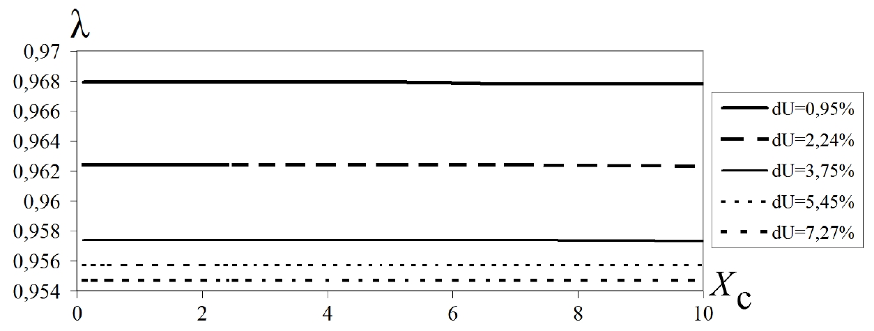 Рисунок 6 – Зависимости λ от Xс при вариации Xл в соответствии с различными уровнями потерь напряжения dU