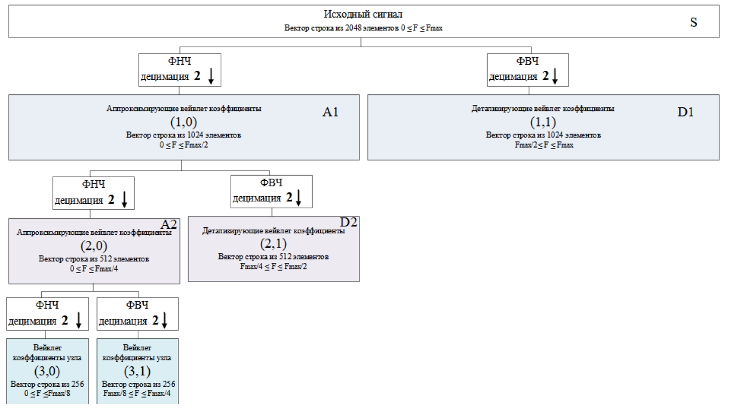 Повторив процедуру для аппроксимирующих коэффициентов первого уровня разложения в соответствии со схемой на рисунке 3 можно получить аппроксимирующие и детализирующие коэффициенты второго уровня разложения и т. д. [5].