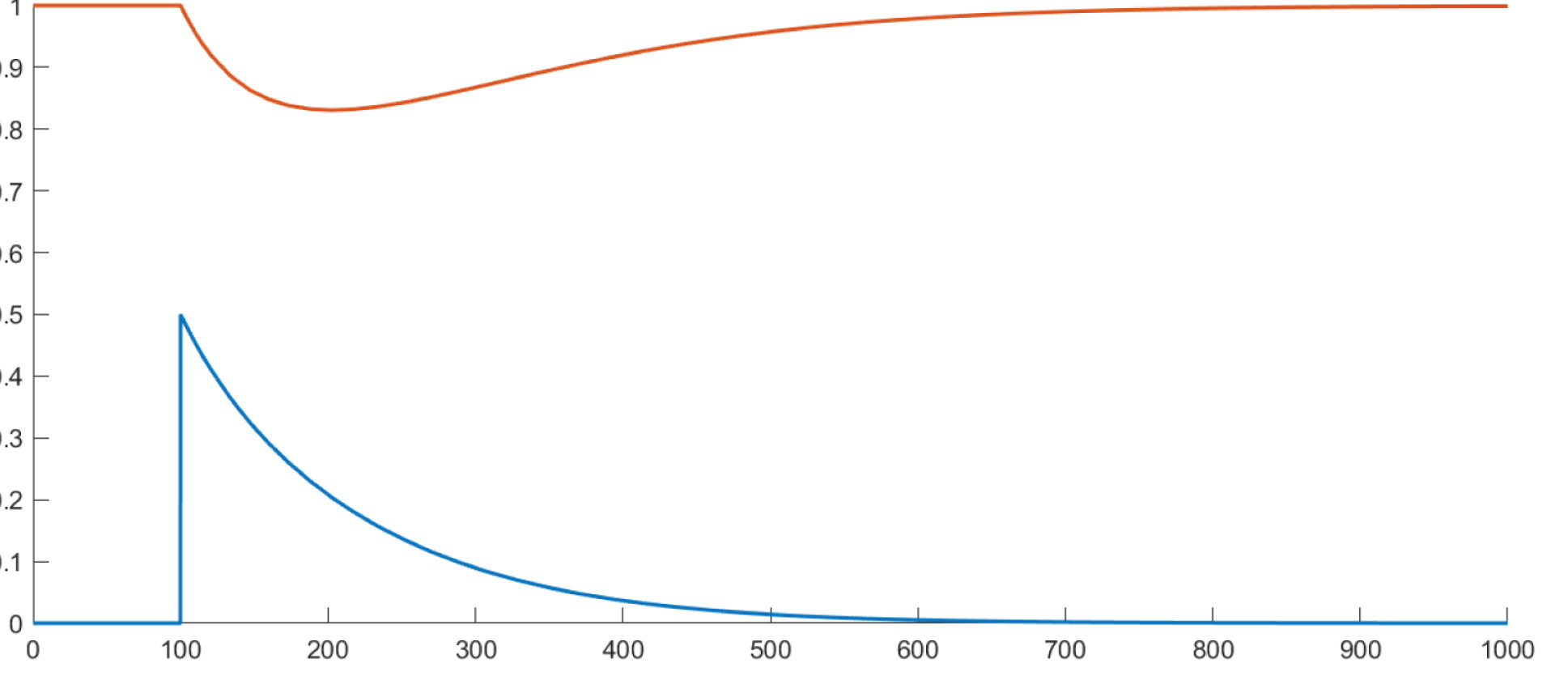 Верхний график показывает уровень кислорода. Как и ожидалось, он снижается в процессе окисления загрязняющего вещества, а затем восстанавливается после уменьшения уровня загрязнения.