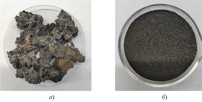 Рис. 1. Зола от сжигания лузги подсолнечной, отработанной отбеливающей глины, содержащей растительные масла, и отходов механической очистки масличных семян: а – исходный образец; б – после измельчения (размер фракции менее 1 мм)