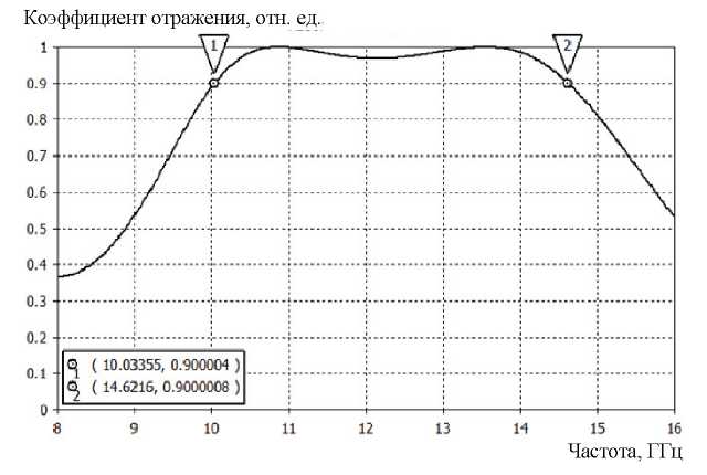 Имитационное моделирование проводилось при условии падения волны под прямым углом к поверхности. Результатом проведенной симуляции является график частотной зависимости коэффициента поглощения (рис. 2). Из графика следует, что поглощение волны на уровне 90 % от общей энергии происходит в интервале от 10,03 до 14,62 ГГц. При нормальном падении волны на смоделированную поверхность происходит поглощение в частотной полосе шириной 4,59 ГГц.