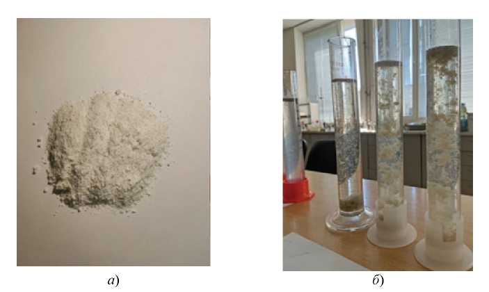В качестве комбинированного реагента использовали коагулянт-флокулянт алюмокремниевого состава (АКФ) в порошкообразном виде, предоставленный ООО «Промышленная компания “Юго-Запад-Химпром”» (Белгород, Россия). Химический состав АКФ представлен содержанием следующих оксидов, масс.%: SiO2 – 25,43; Al2O3 – 16,47; Na2O – 9,51; K2O – 3,04; Fe2O3 – 1,25; CaO – 0,70; MgO – 0,24; SO₃²⁻ – 43,10. Внешний вид и процесс коагулирования взвешенных веществ при использовании АКФ представлены на рис. 1.