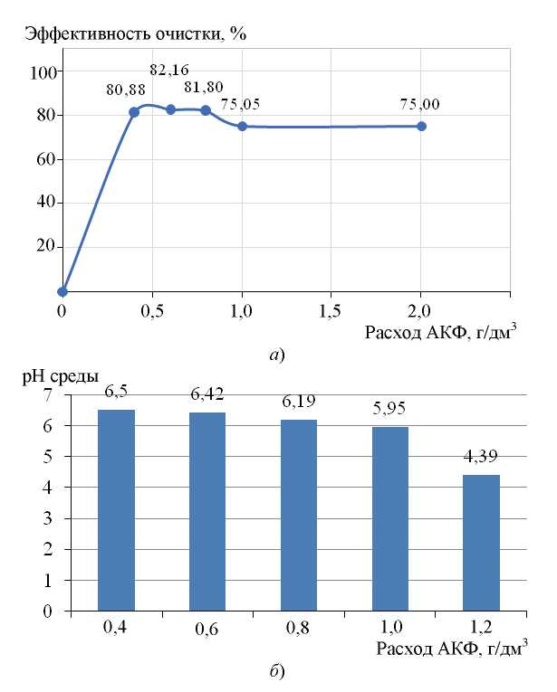 Рис. 2. Влияние расхода АКФ на эффективность очистки по мутности (а) и рН очищенного стока (б)