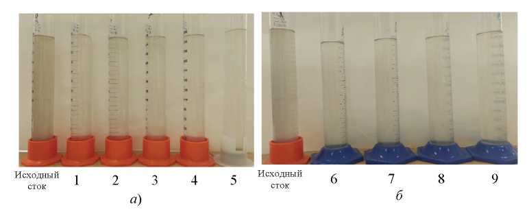 Экспериментальные исследования по использованию АКФ для осветления проб городских сточных вод проводили следующим образом: в стеклянный стакан помещали 1000 см3 воды и навески АКФ и регуляторов кислотности. Полученную смесь перемешивали с помощью магнитной мешалки: время быстрого перемешивания – 3 мин, медленного – 12 мин. Далее пробы переливали в цилиндры и отстаивали в течение 1 ч. Эффективность очистки рассчитывали по формуле