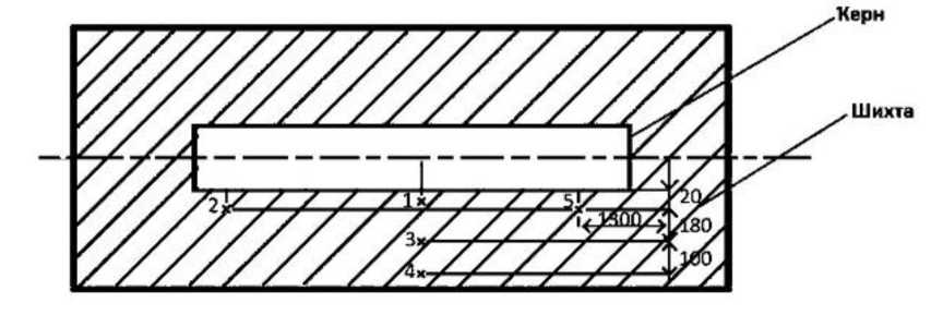 Измерение температур в печи сопротивления производилось непосредственно вольфрам-рениевой термопарой (№ 1) и хромель-алюмелевыми термопарами (№№ 2–5). Время эксперимента – 26 часов, что составляет полный цикл работы печи. Схема расположения всех термопар в горизонтальной плоскости показана на рис. 3, где изображено продольное сечение керна и самого блока загрузки.