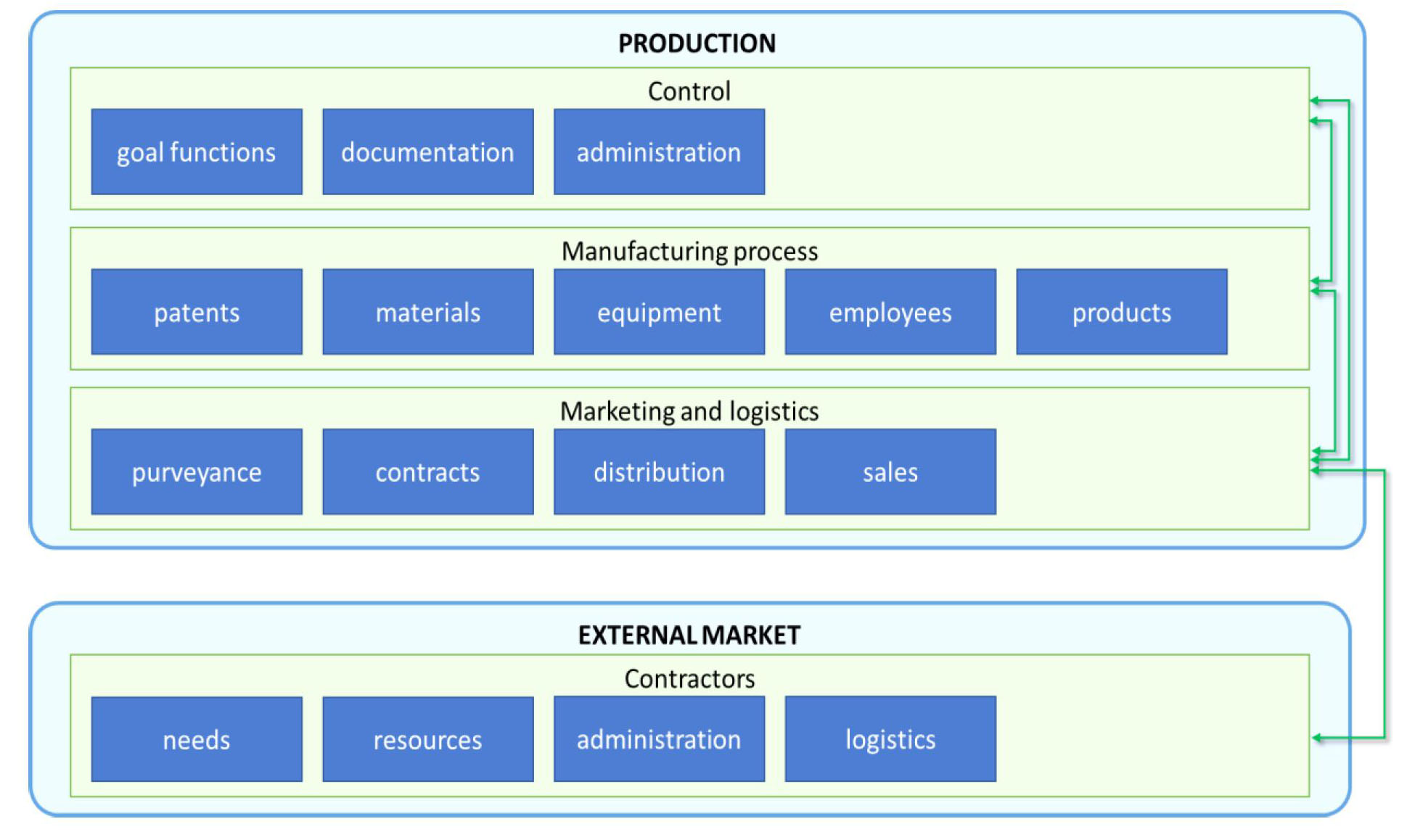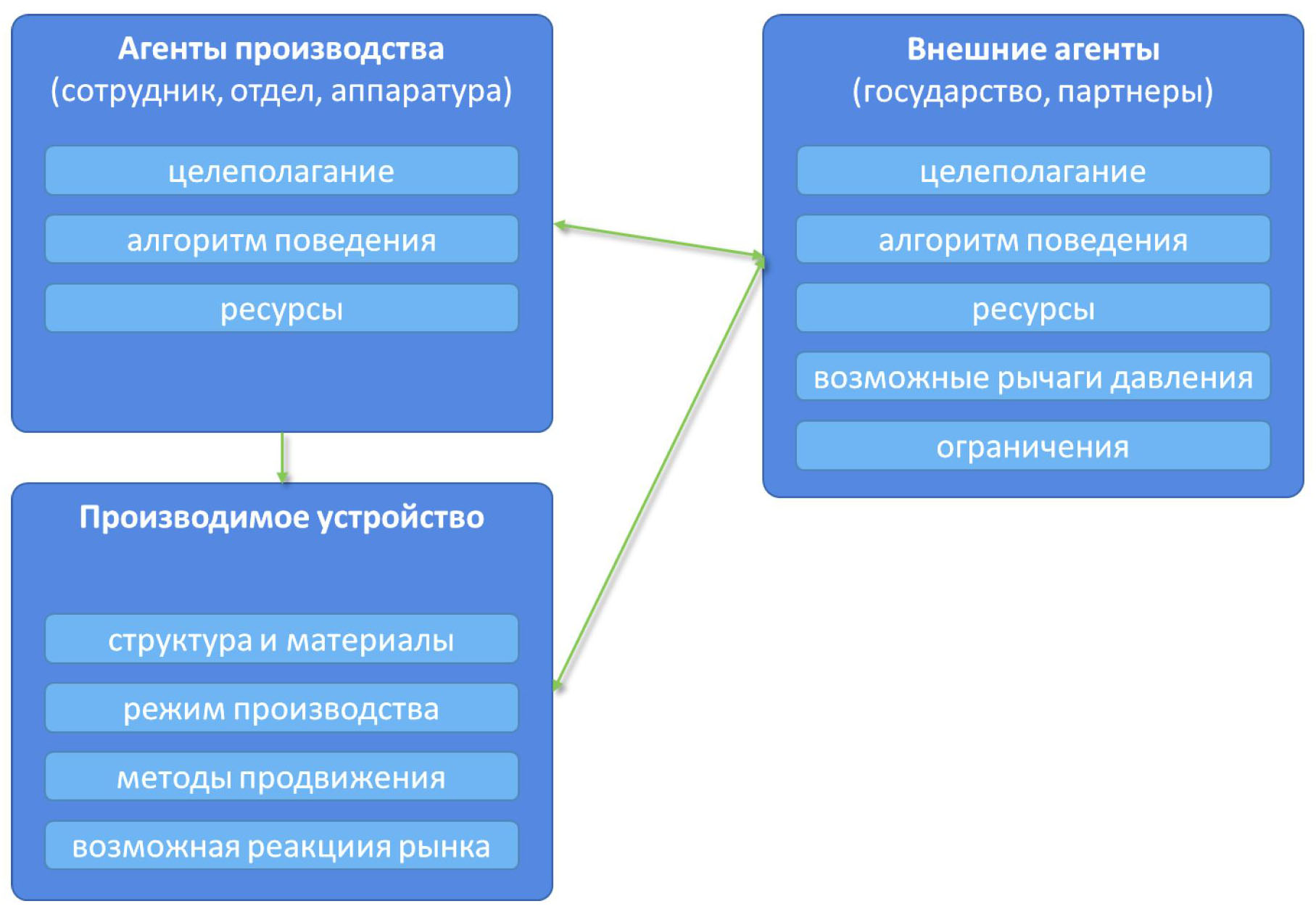 A production agent (an employee, a piece of equipment or a department of an enterprise) consists of its own goal-setting system (not necessarily related to the overall goal of the enterprise) and a behavior algorithm. In addition, each such agent has a different set of resources available to it, the exchange of which ensures the operation of production chains. The external agents here are the state, buyers, partners and competitors. External agents may have the ability to limit the work of production agents and have available leverage, that is, the possibility of production influencing them.