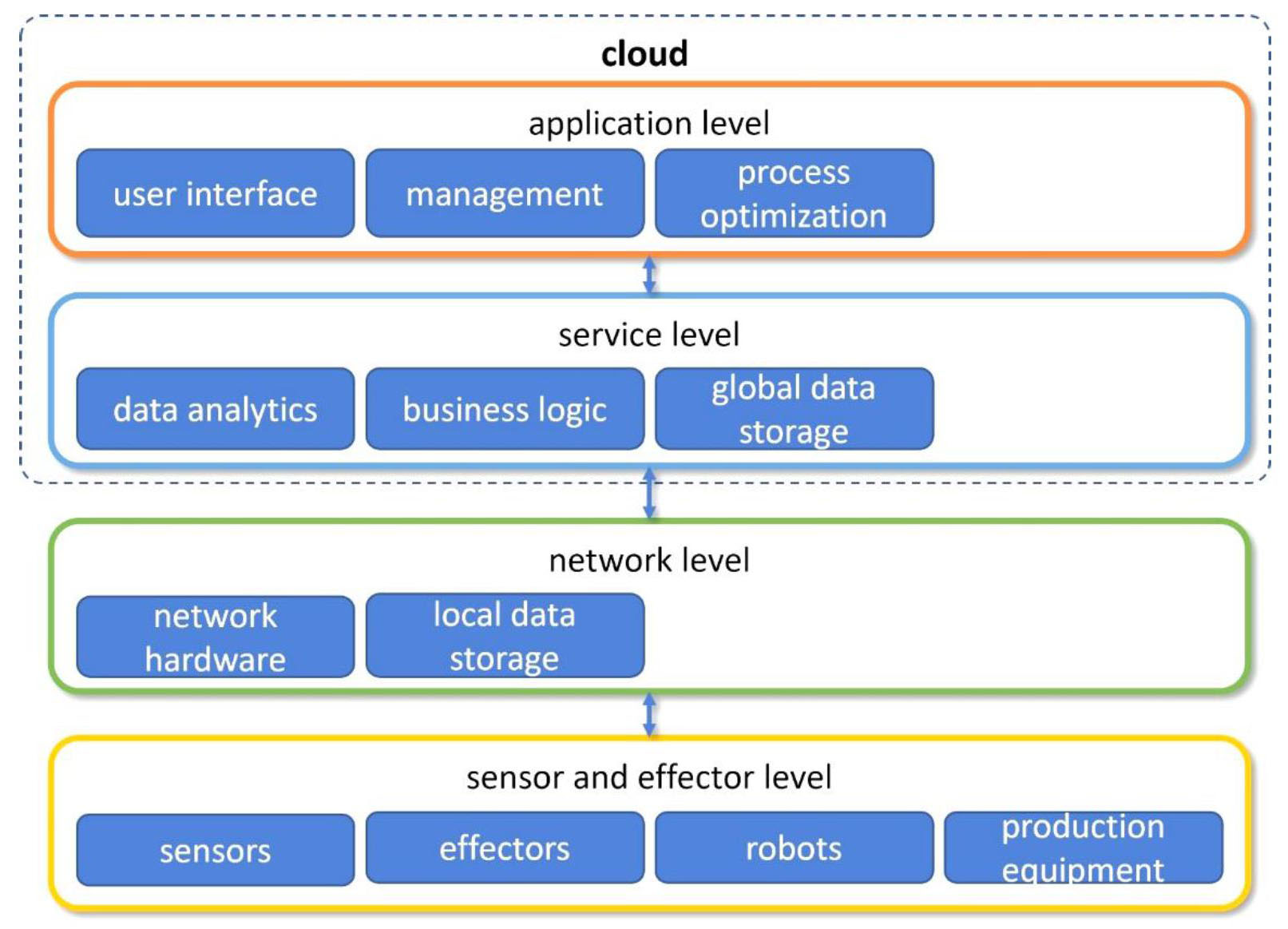 Technologies related to Industry 4.0 have been successfully introduced into modern production for quite a long time. For example, Internet of Things (IoT) technologies find application in automating the collection and processing of information from production sites [3]. For example, the use of wireless sensor networks can significantly reduce the cost of laying cables in a building, which often allows significant savings despite the high cost of the sensors themselves. At the same time, many of the sensors used often have on-board data pre-processing systems, which makes it possible to relieve the data transmission network and promptly respond to a number of emergency situations at the place of their recording. In addition, the authors proposed a service-oriented architecture for IoT systems in manufacturing (Fig. 2). At higher levels of the architecture, the received data is processed using big data technologies and artificial neural networks.