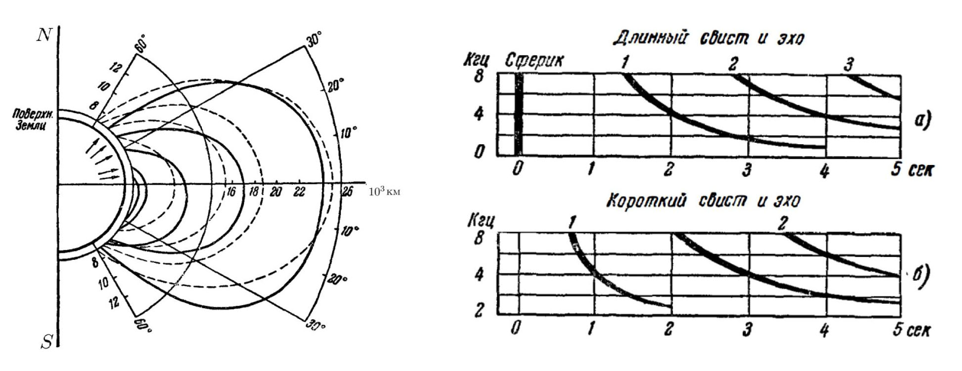 Экспериментально регистрируемые вистлеры разделяют на короткие и длинные. Короткие свисты генерируются в магнитно-сопряженной точке на другом конце земного шара, длинные свисты генерируются в той же точке, в которой осуществляется их прием, но совершают путь до магнитно-сопряженной точки и обратно (рис. 1).