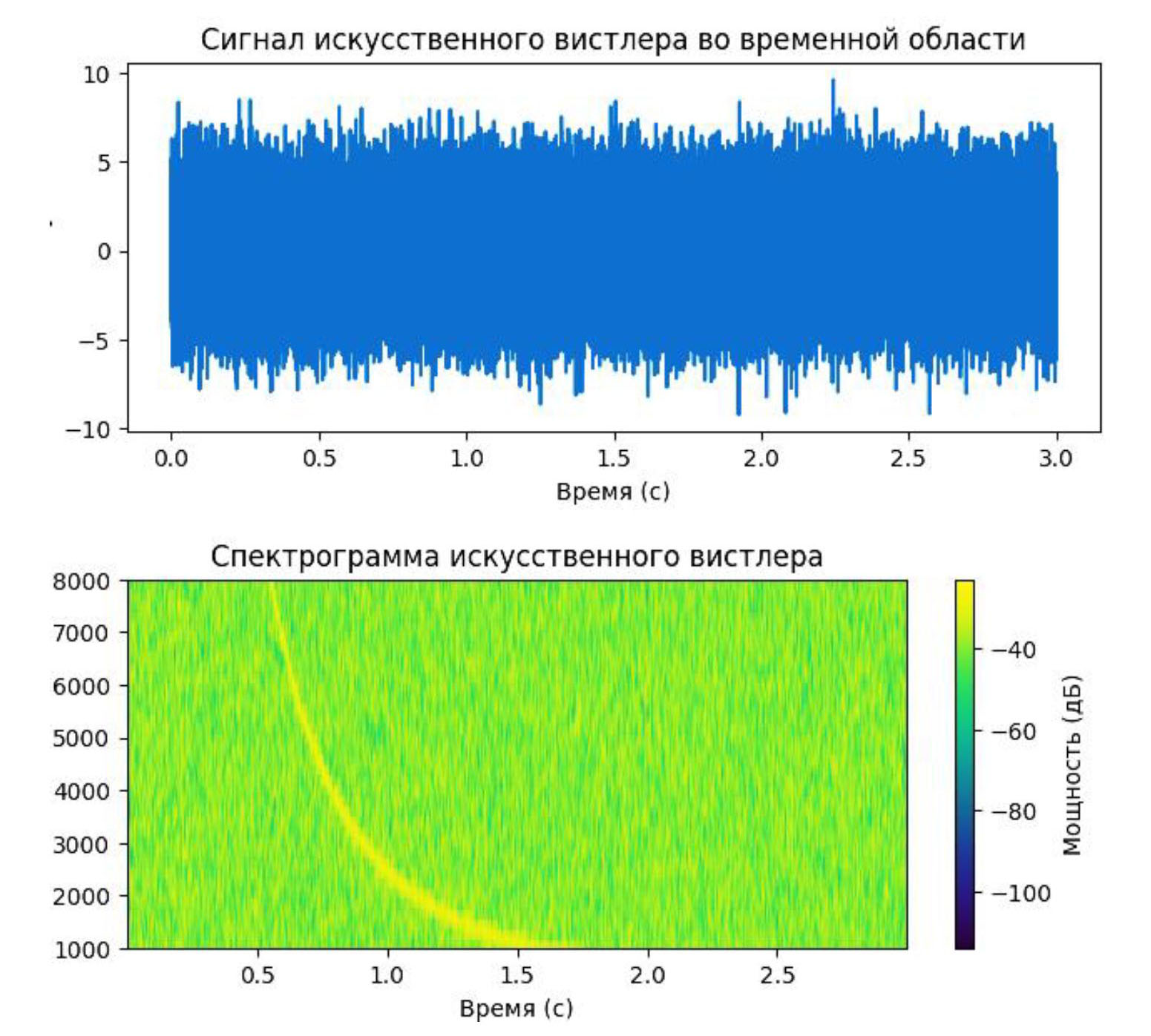 Основные этапы заключаются в подключении соответствующих математических библиотек numpy, scipy, а также библиотеки для визуализации matplotlib. Далее определяются временная ось и функция для генерации искусственного вистлера на основе соотношения (2). Чтобы данные были приближены к реальным, добавляется в генерацию вистлера случайный шум, который имеет нормальное распределение с нулевым средним и стандартным отклонением 0.1. Далее проводится визуализация искусственного сигнала во временной области, а также строится спектрограмма частот с помощью команды signal.spectrogram из библиотеки scipy.