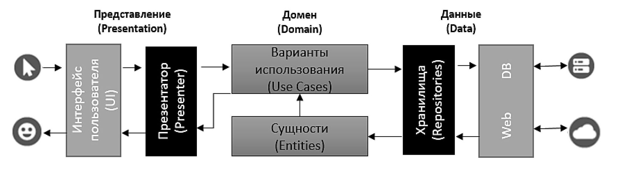 Шаблон «Clean Architecture» занимается объединением слоев в модули. Речь идет о презентации с пользовательским интерфейсом, презентатором и ViewModels, домене с сущностями и организацией взаимодействия данных, с включением баз данных, там также содержатся Rest-клиенты.