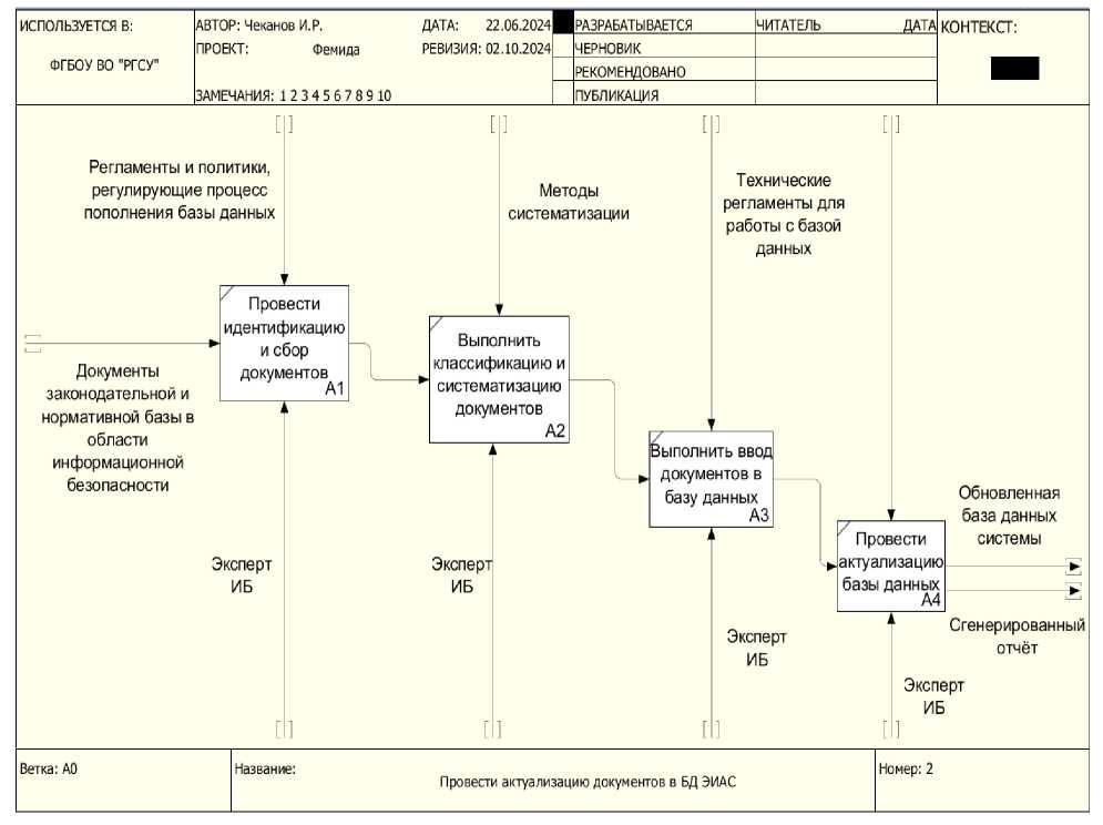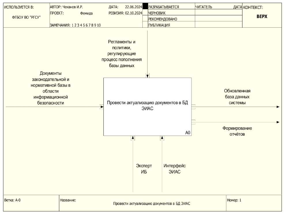 Процесс реализуется конкретным исполнителем – экспертом в области ИБ с применением ЭИАС, взаимодействие осуществляется через разработанный интерфейс системы. Выходная информация процесса актуализации НД в области ИБ представлена выходными стрелками: это обновленная база данных НД в области ИБ, а также процессы формирования отчетной документации о работе ЭИАС.