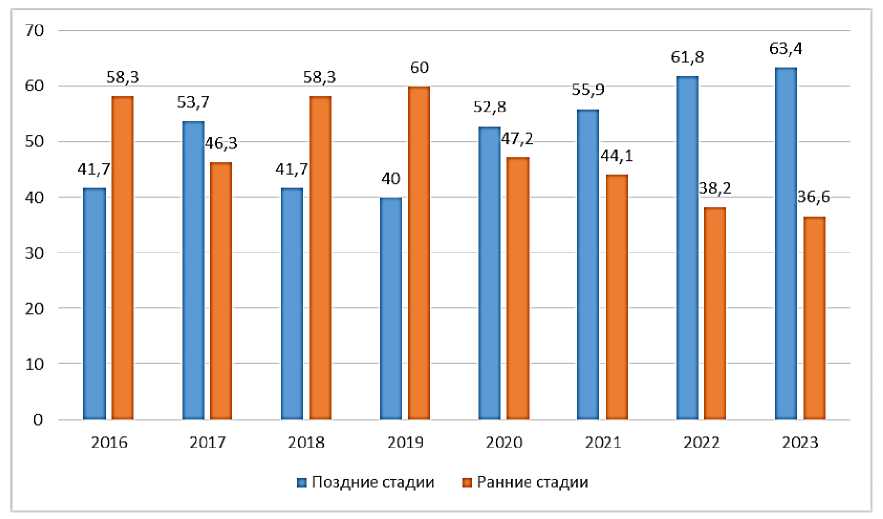 Fig. 1. Statistics of financing rounds of high-tech projects on the scale of the global venture market in 2016-2023, %