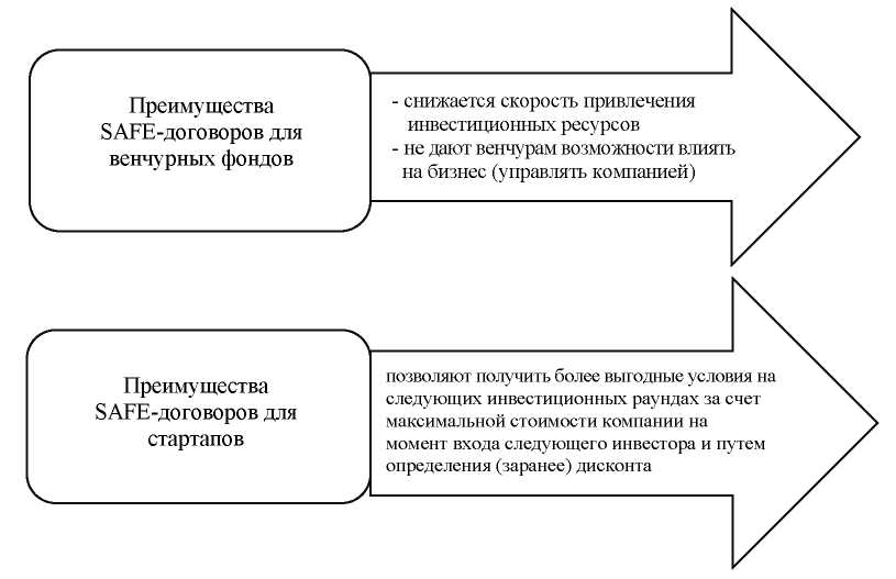 Трансформации на венчурном рынке коснулись также и используемых венчурными фондами инвестиционных инструментов. Наблюдается рост популярности так называемых SAFE – договоров, которые на сегодняшний день получили активное развитие в странах Европы и США. Первоначально они были разработаны и внедрены в мировой практике для решения проблемы привлечения венчурных инвестиций на ранних раундах развития стартапов в 2013 г.14 Такой договор, по сути, представляет собой возможность владения инвестором доли бизнеса по его стоимости в будущем.