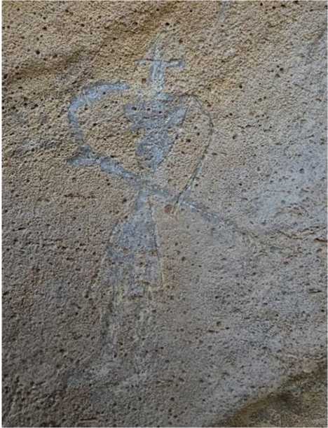 Рассматриваемые нами детали наскальной картины вырезаны на скале известняковой породы высотой около 1000 м над уровнем моря. Наскальная картина представляет собой сцену охоты людей на оленей и занимает площадь 100 х 90 см. В центре картины находятся две антропоморфные фигуры с мечом на уровне пояса (рис. 3, 4). Мечи, судя по изображению, скорее всего, являются металлическими. Подобные изображения людей с мечами малоизвестны. В основном встречаются петроглифы с изображением антропоморфных фигур с луками и стрелами либо копьями. Возможно, древний художник хотел изобразить не только охотников, но и воинов – как выделяющийся класс социальной иерархии.